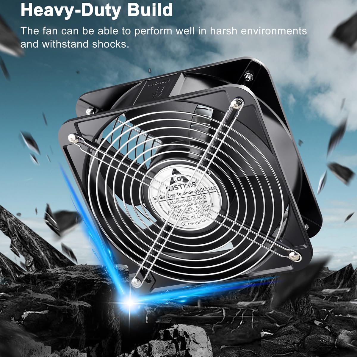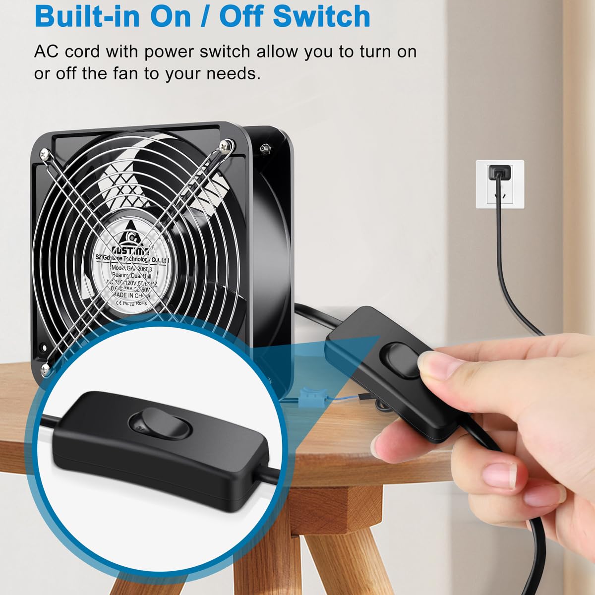 Convenient and Safe: The fan runs on 100 to 120V AC, 5FT power cord that can be easily attached to the fan's metal terminals and allows it to be powered through a wall outlet; with Power Switch enables to turn on/off the fan easily; This heavy industrial fan is ideal for noise tolerant projects which need additional air movment/cooling