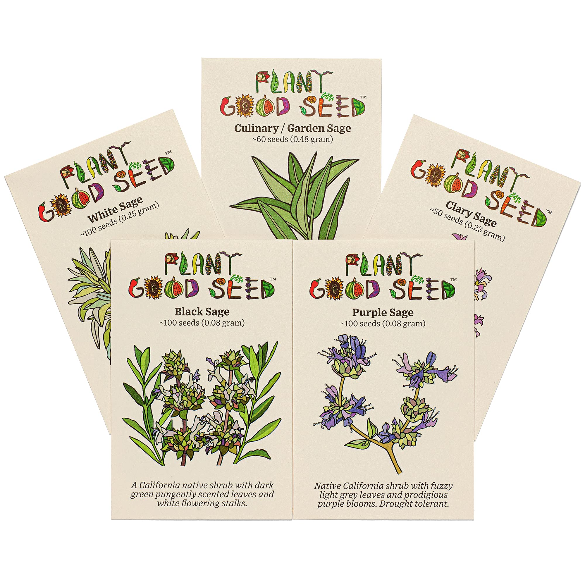 SAGE SEED COLLECTION - Our sage seed collection includes one packet each of: Black Sage (100 seeds), Clary Sage (50 seeds), Garden / Common Sage (58 seeds), Purple Sage (100 seeds), and White Sage (50 seeds)