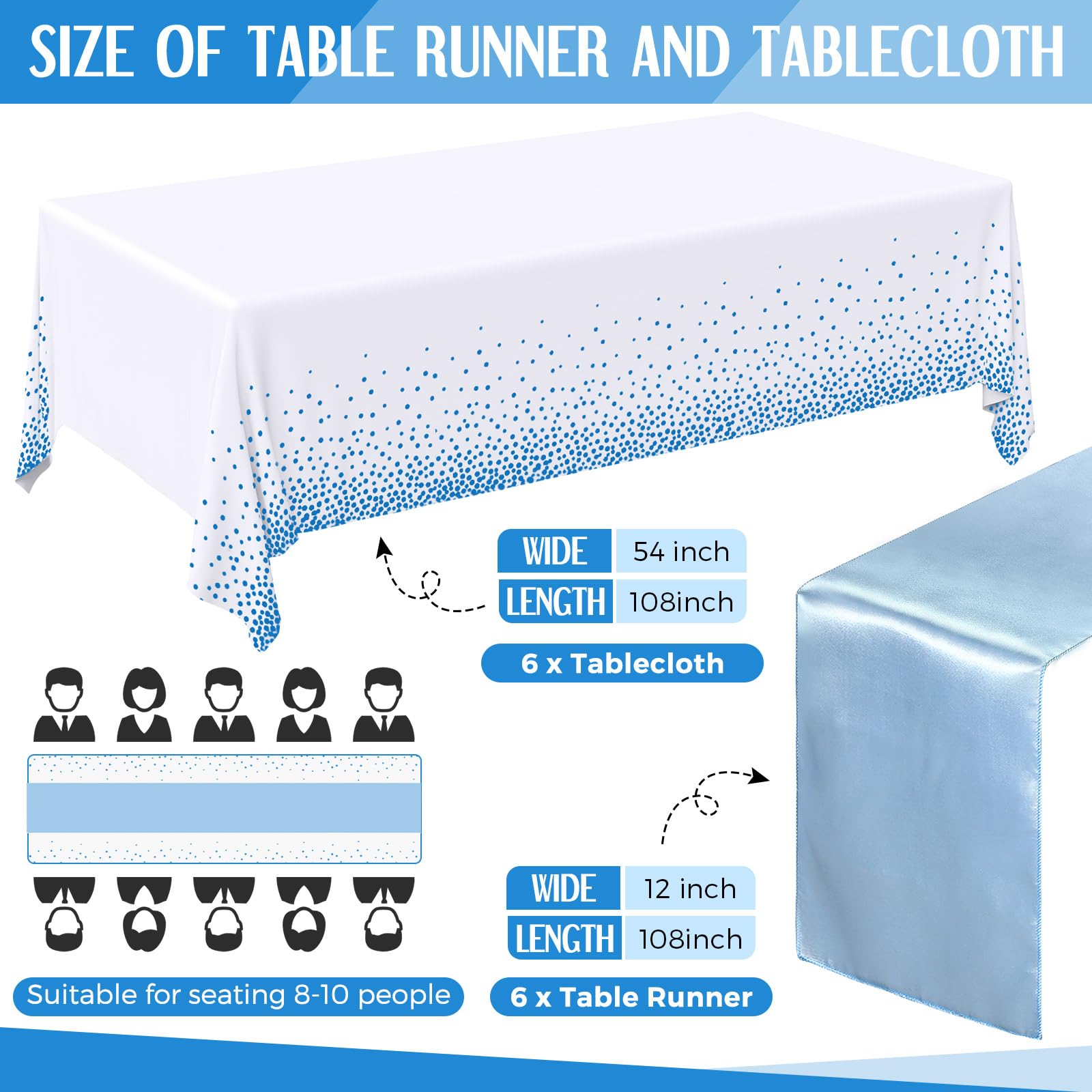 Sufficient Quantities: what you will receive are 12 packs of table covers, containing 6 pieces of plastic tablecloths and 6 pieces of satin table runners; Besides, the sets of table decorations can reduce your selection time and meet your replacement needs