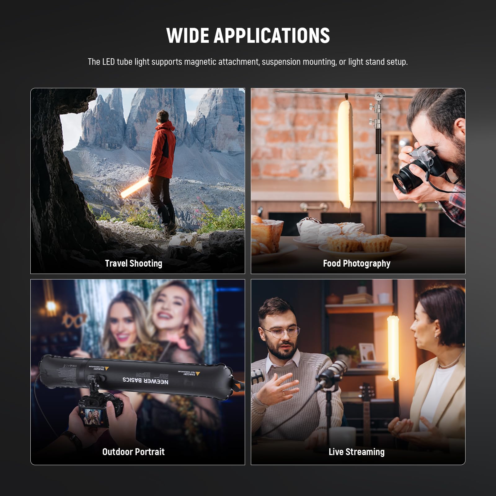 【Travel Friendly Inflatable Tube Light Kit】 This soft TPU light wand equipment easily folds into a compact size, incredibly lightweight (4.87oz/138g) and portable compared to metal or other bulky hard plastic led light sticks. Yet Once inflated, this photography prop reaches a length of 23.6"/60cm, providing impressive continuous lighting coverage for YouTube video recording, portrait & still life photo, studio indoor camera photoshoot, filming, outdoor films, vlogs, and travel shooting