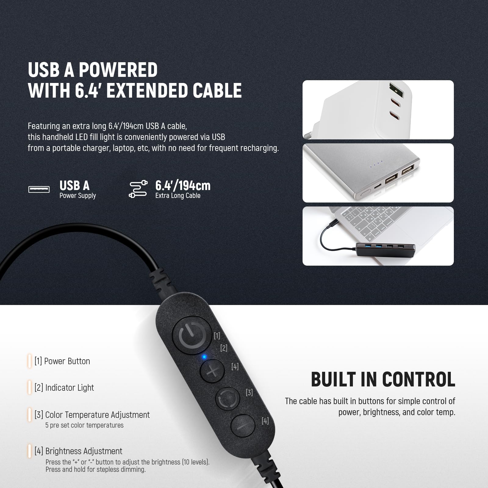 【USB A Powered with 6.4' Extended Cable】 Featuring an extra long 6.4'/194cm USB A cable, this handheld LED fill light is conveniently powered via USB from a portable charger, laptop, etc, with no need for frequent recharging. The extended cable provides greater flexibility for placement and movement during lighting setup. The cable has built in buttons for simple control of power, brightness, and color temp. Includes a portable carry bag to accommodate all accessories for easy transport