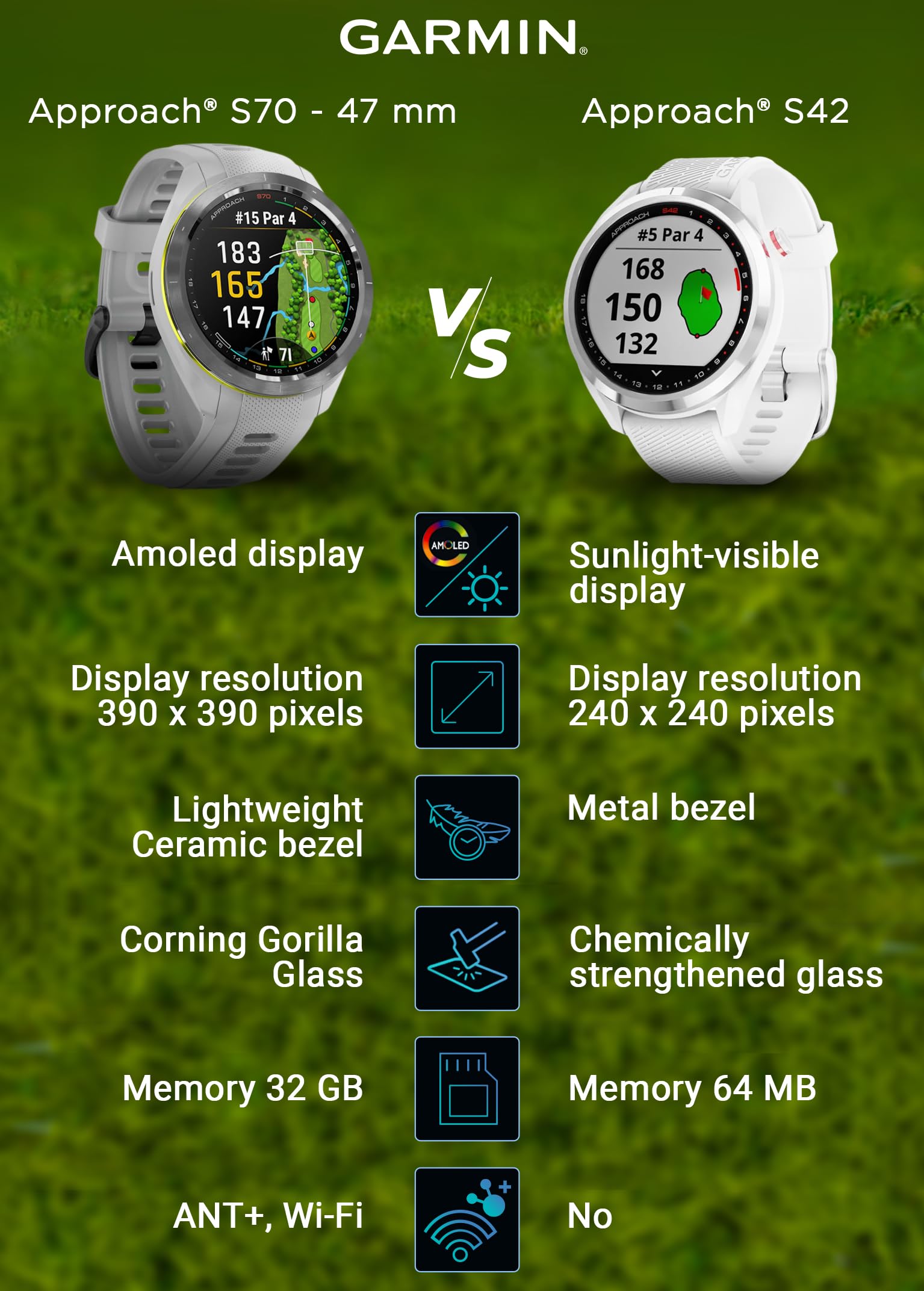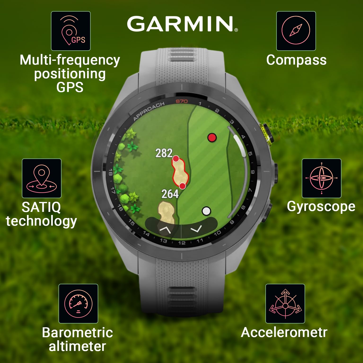 [Garmin Approach S70] a 42 mm high-performance smartwatch w/ Black Ceramic Bezel & Powder Gray Silicone Band, designed for everyday use without any compromises.