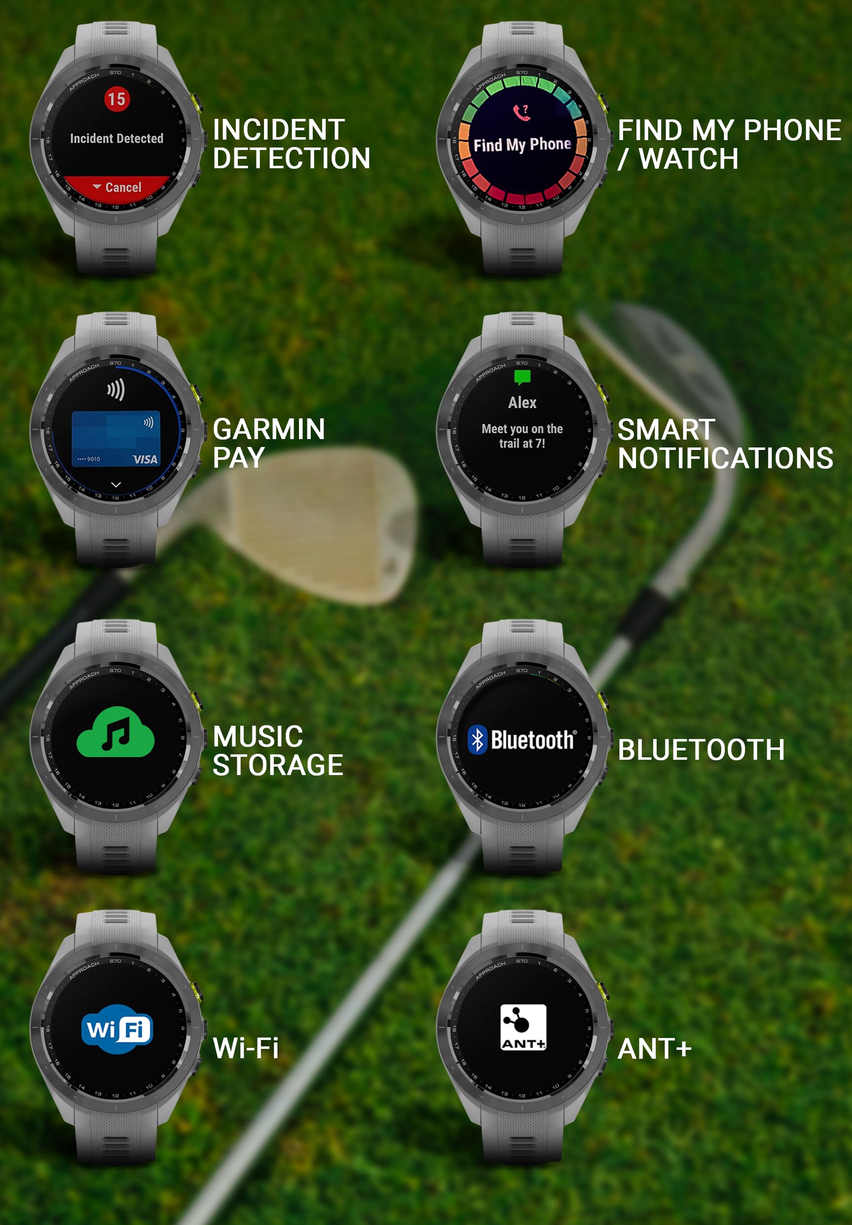 [Smart & Safety] provides smart notifications, music downloads, Garmin Pay, safety alerts, stock tracking, customization options, and battery life management.
