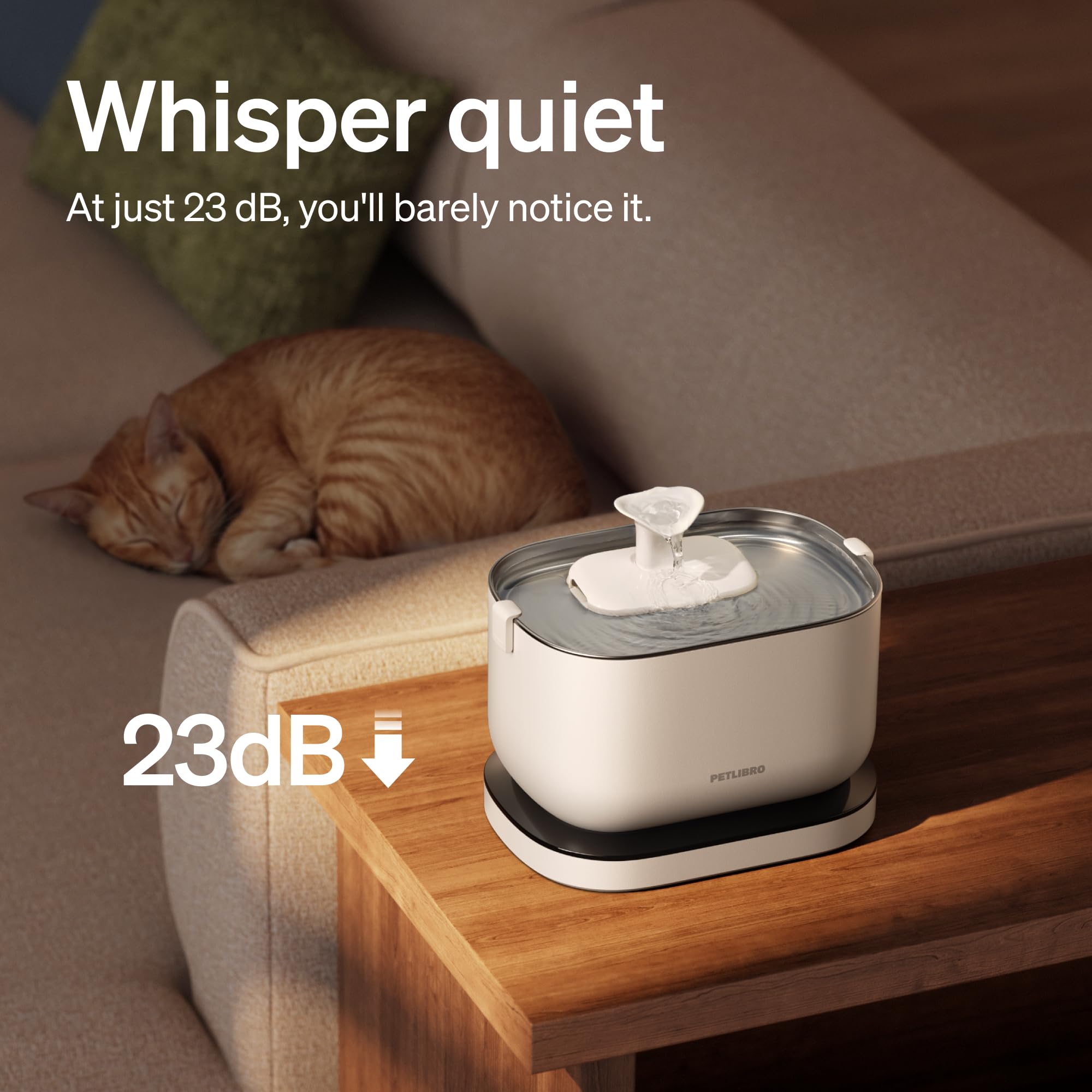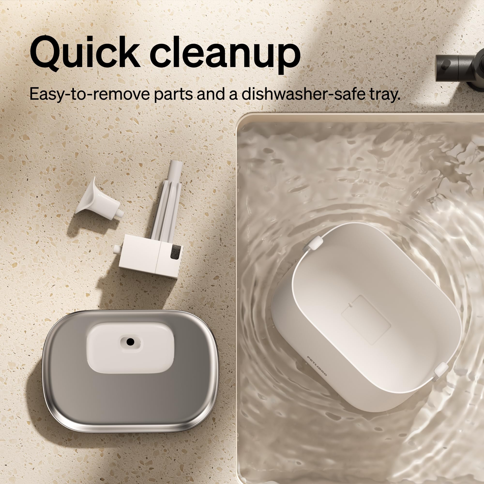 PETLIBRO Cat Water Fountain, Wireless Pet Fountain Battery Operated, 2.5L/84oz Dockstream Automatic Dog Waterer Dispenser for Drinking with Quiet Pump Inside Stainless Steel Tray Easy Cleaning BPA-Free Package Contents:1x Dockstream Battery Operated Cat Water Fountain1x Wireless Pump1x Multi-layer; Filter1x; Pump Sponge1x; Cleaning Brush1x AC Power Adapter1x User Manual; Specification: Capacity: 2.5L(86Fl oz)Material: SUS 304 Stainless Steel & ABS Adapter Power Input: 100V~240V 50/60HZ Power Output: 5V/1A Battery capacity: 5000mAh Product Dimensions: 9.1*7*6.3 inches / 232*161*177 mm Net Weight: Approx 2.55pounds / 1.16Kg Important Note:1. Only for indoor use. 2. Not dishwasher safe. 3. For your pet’s health and to prolong pump service life, it is recommended to change the water and clean the water tank, tray, foam filter, and pump at least once a week.4. If you have multiple pets, it is recommended to clean the water fountain and change the filter more often.5. If your pet refuses to use the water fountain, it is recommended to leave its previous water source next to the water fountain for a while.Your pet may need some time to get familiar with it. If your pet gets used to drinking from this Water Fountain, you can remove the previous water source.6. If the water fountain makes more noise than expected, check if the water level is above the minimum recommended level and if the impeller is covered by the scale. It is recommended to clean the impeller once a week.7. How to remove the scale: Remove the pump cover, and soak for 30 minutes with a 1:1 ratio of white vinegar and aqueous solution or food-grade citric acid.8. Not recommended for kittens under 3 months old or large dogs. The Dockstream water fountain is best for cats and small dogs. Please note that naughty pets may tip the fountain over.9. If the Water Fountain is dispensing a low amount of water or dispensing no water, you can reset it by following the steps below: Check if you have installed the Spout and the Filter Tray properly, make sure to refill the water to the maximum level. Wash and clean the Water Pump. If washing doesn’t work, please clean the tough scaling on the water pump and the impeller.