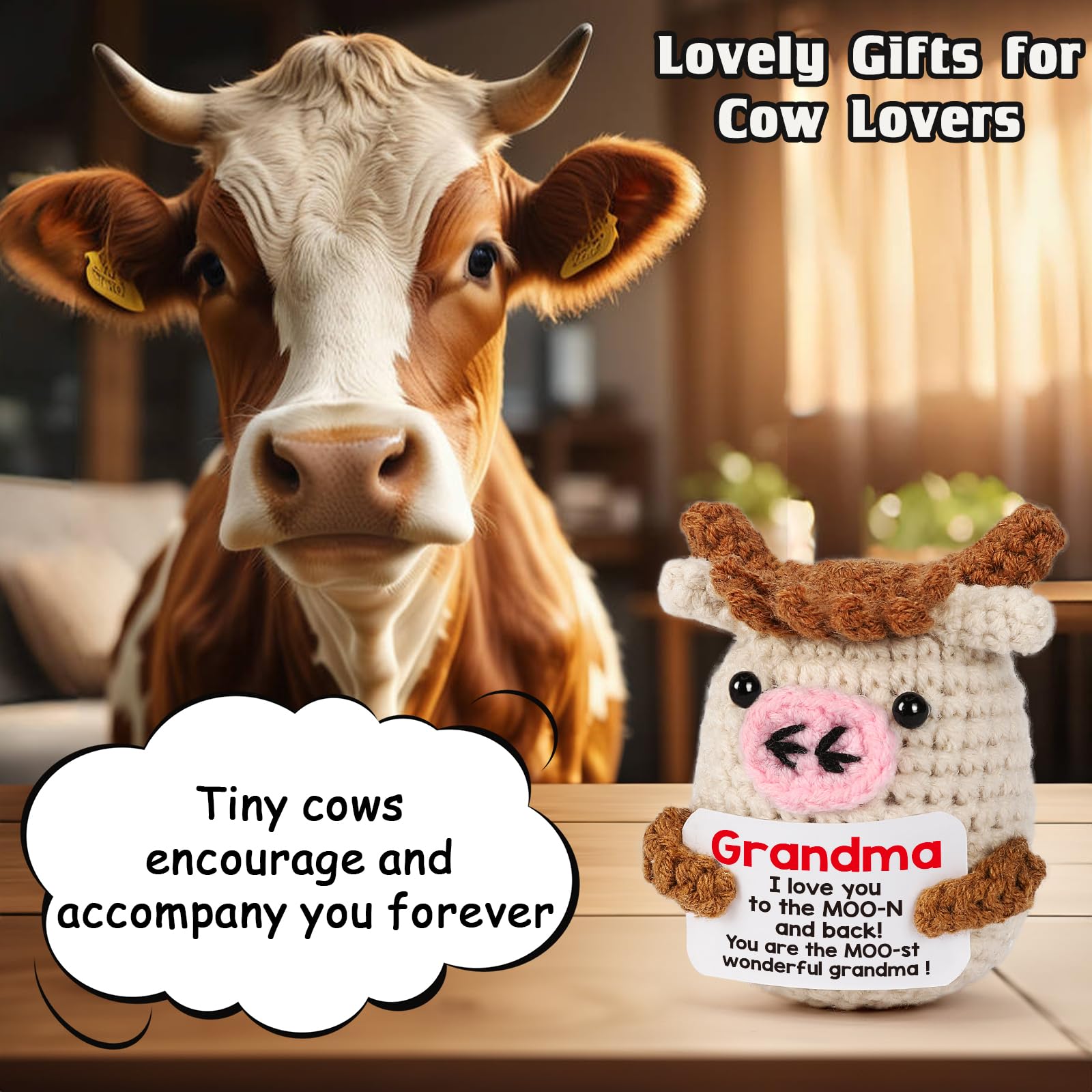 Grandma Gifts for Christmas: This handmade knitted cow doll with its playful message, “grandma I love you to the moo-n and back! You are the moo-st wonderful grandma!” is more than just a cute cow doll, is the perfect way to express love and affection to grandma special