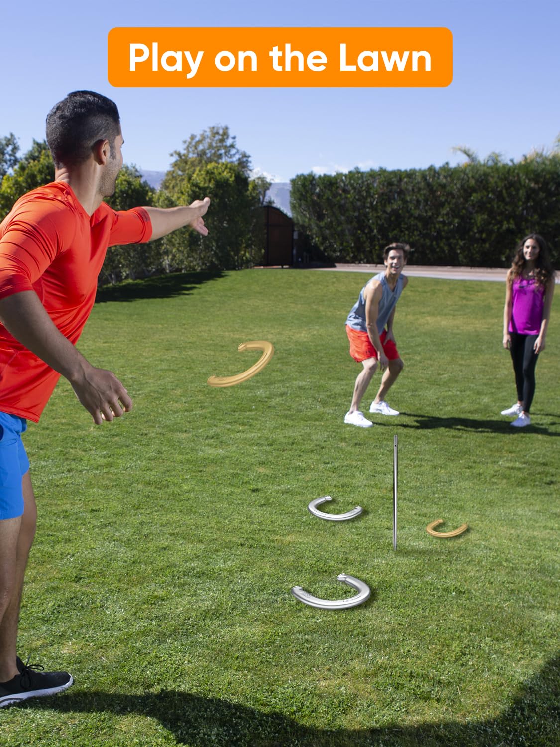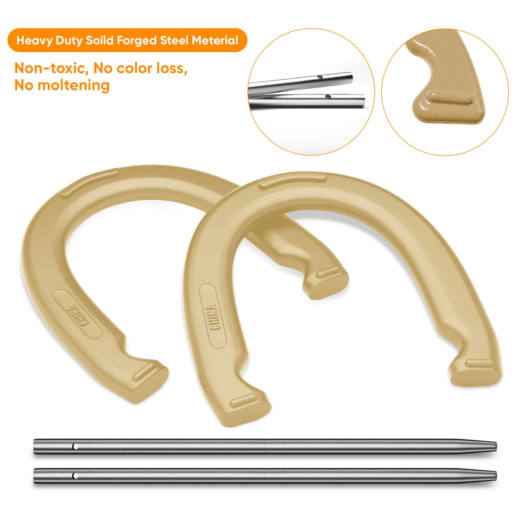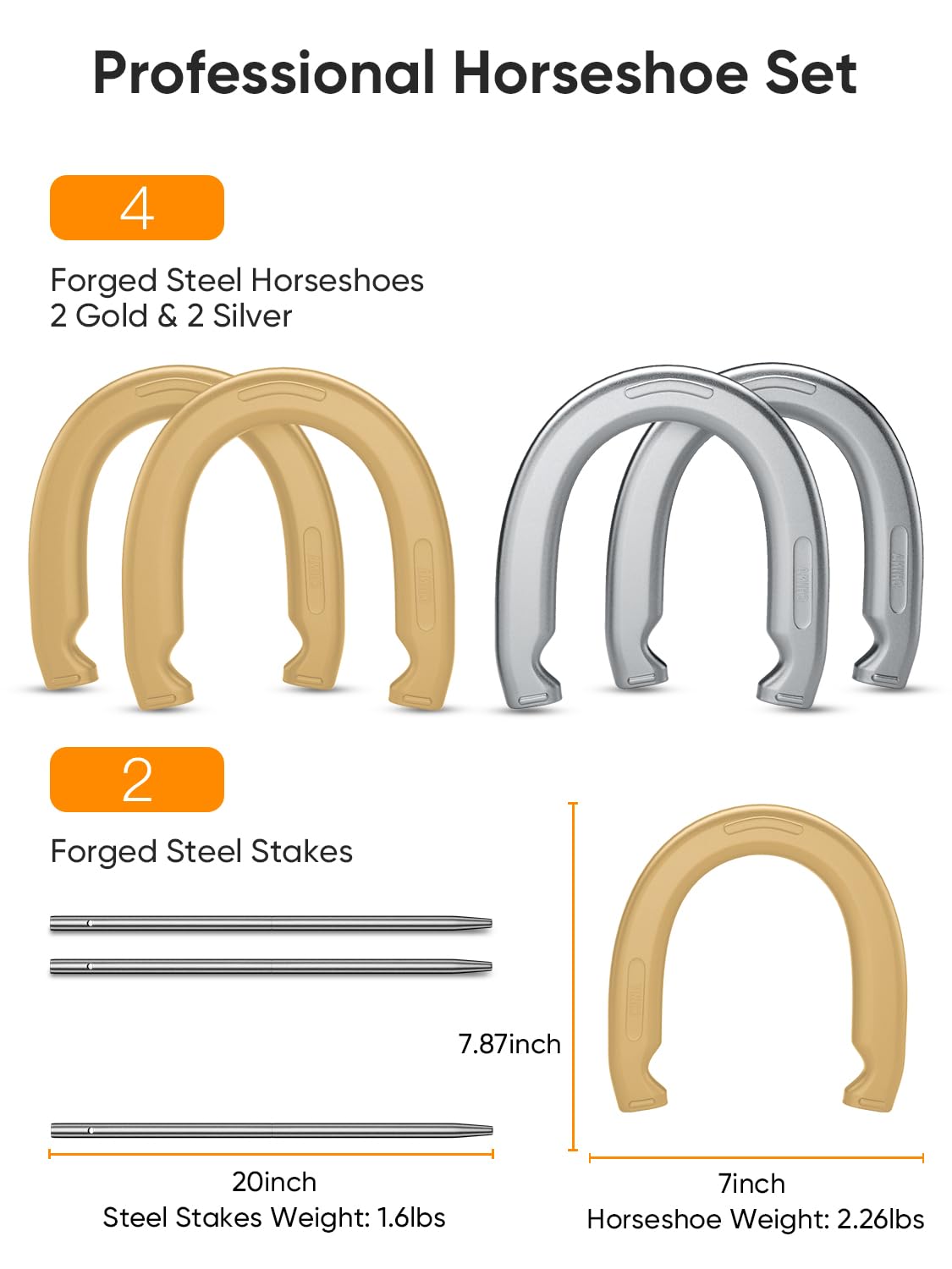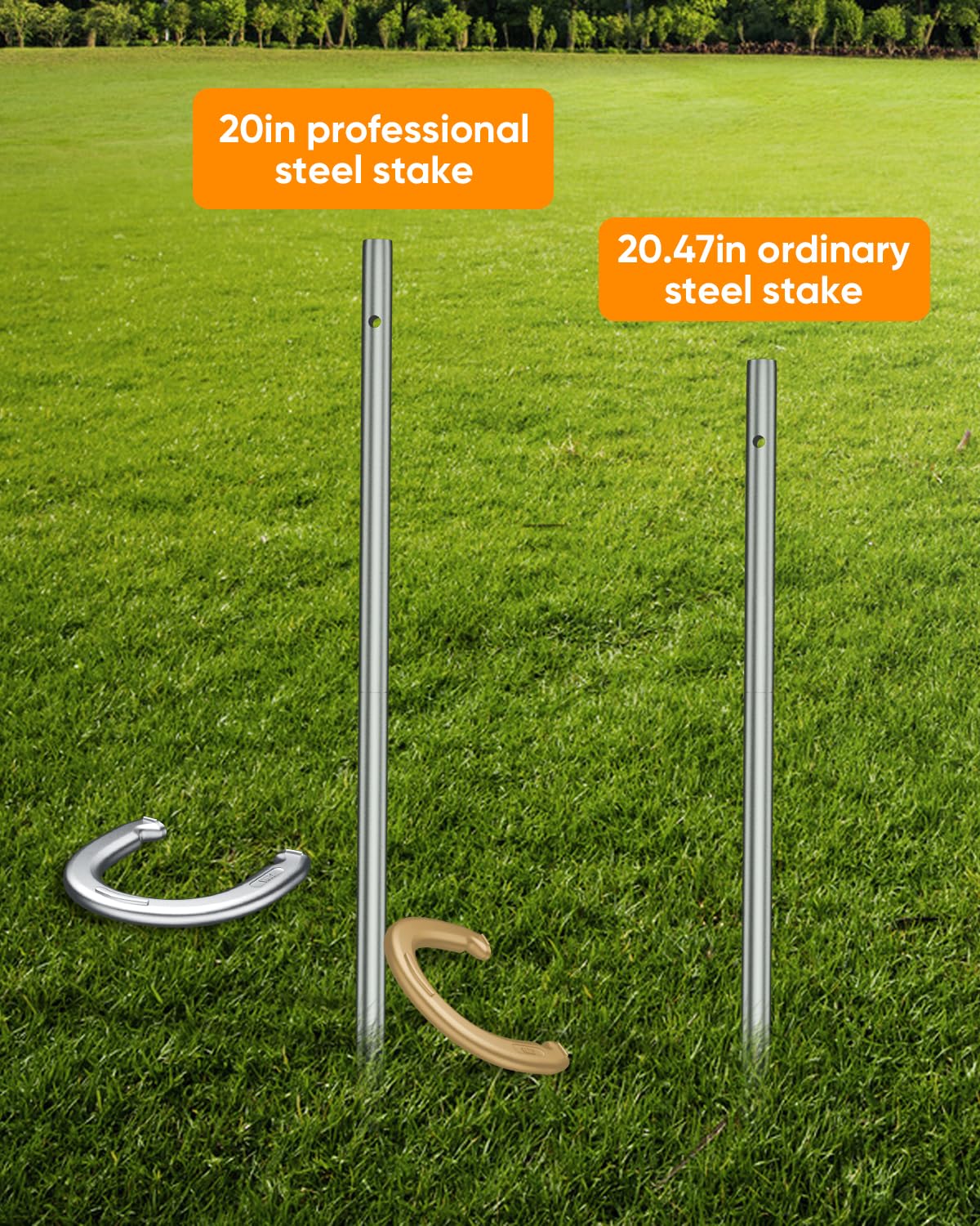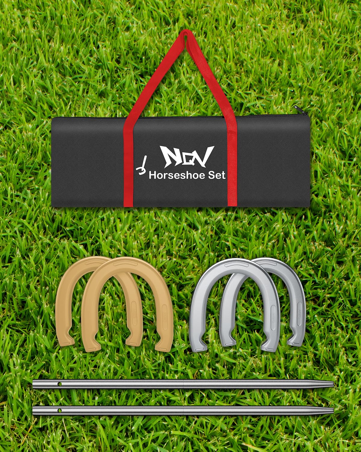 Complete Professional Horseshoe Game Set :This competition-ready set includes 4 weighted steel horseshoes (2 blue, 2 silver), 2 regulation 20" stakes, and a durable carrying case. Perfect for 4 players, the NQV design offers professional performance with portable convenience for any location.