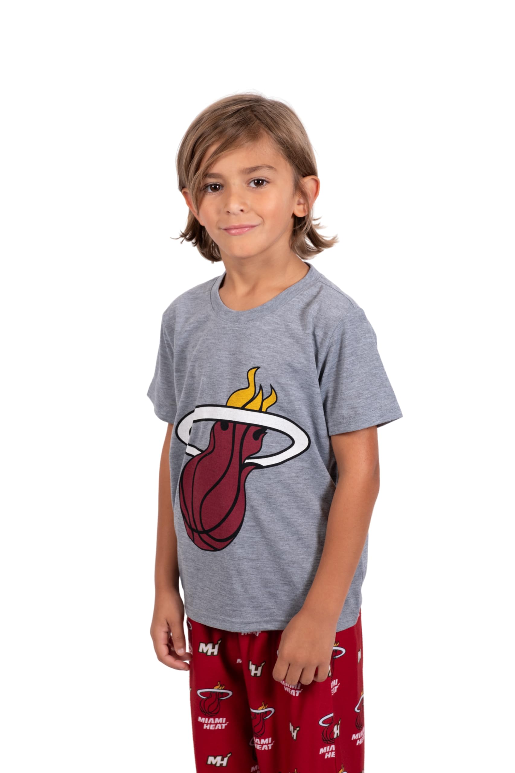 TEAM PRIDE: kids can show their NBA team pride from top to bottom with this set. The bottoms have an all-over print with the team's primary and secondary logos. The top has one large screen print of the primary logo across the front.