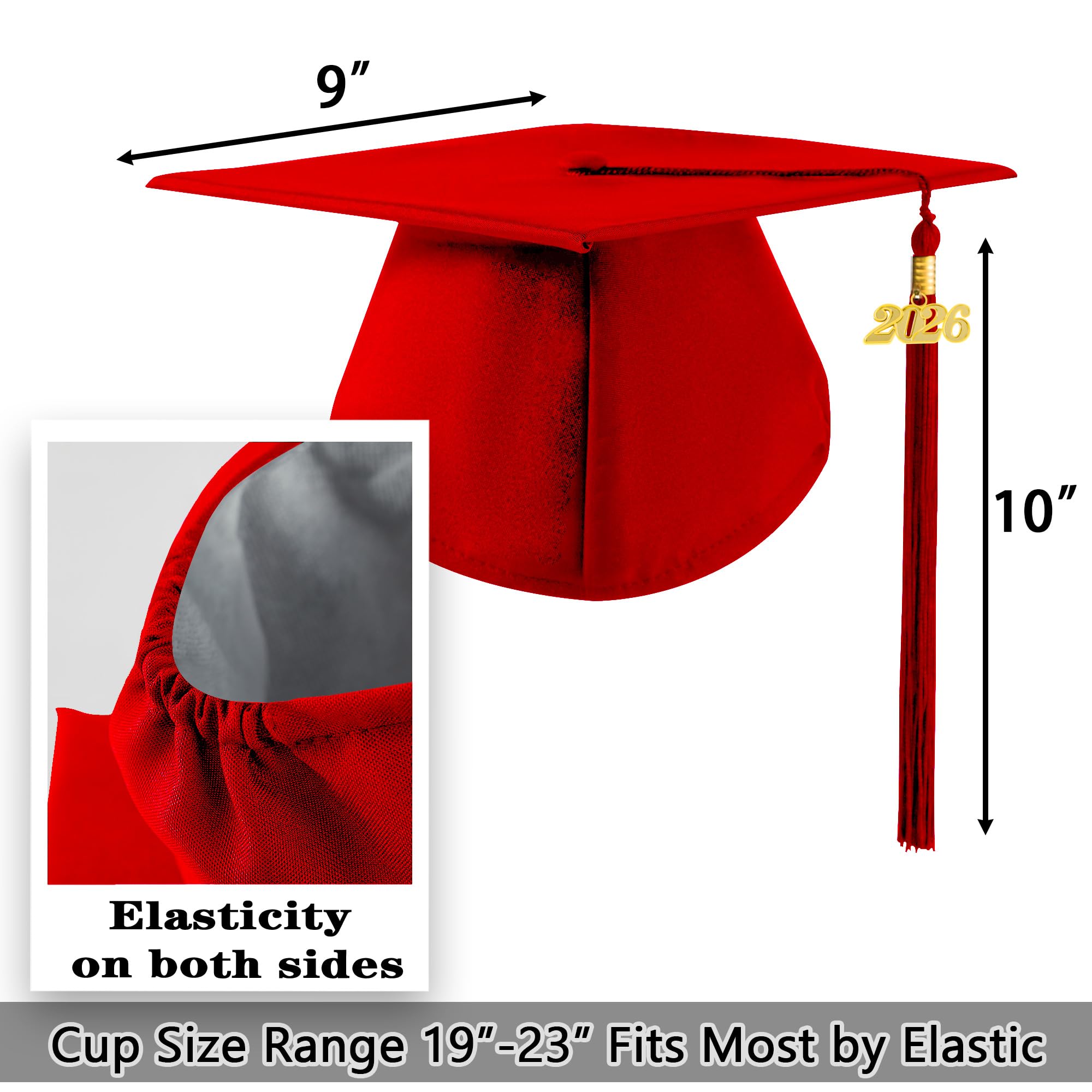 PRODUCT SPECIFICATIONS,PREMIUM MATERIAL:This graduation cap features a classic 9x9 inches hardboard top covered in high-quality matte polyester. It comes with a 9-inch long tassel and a detachable 2026 year charm. The elegant matte finish ensures you look professional and polished on your big day.