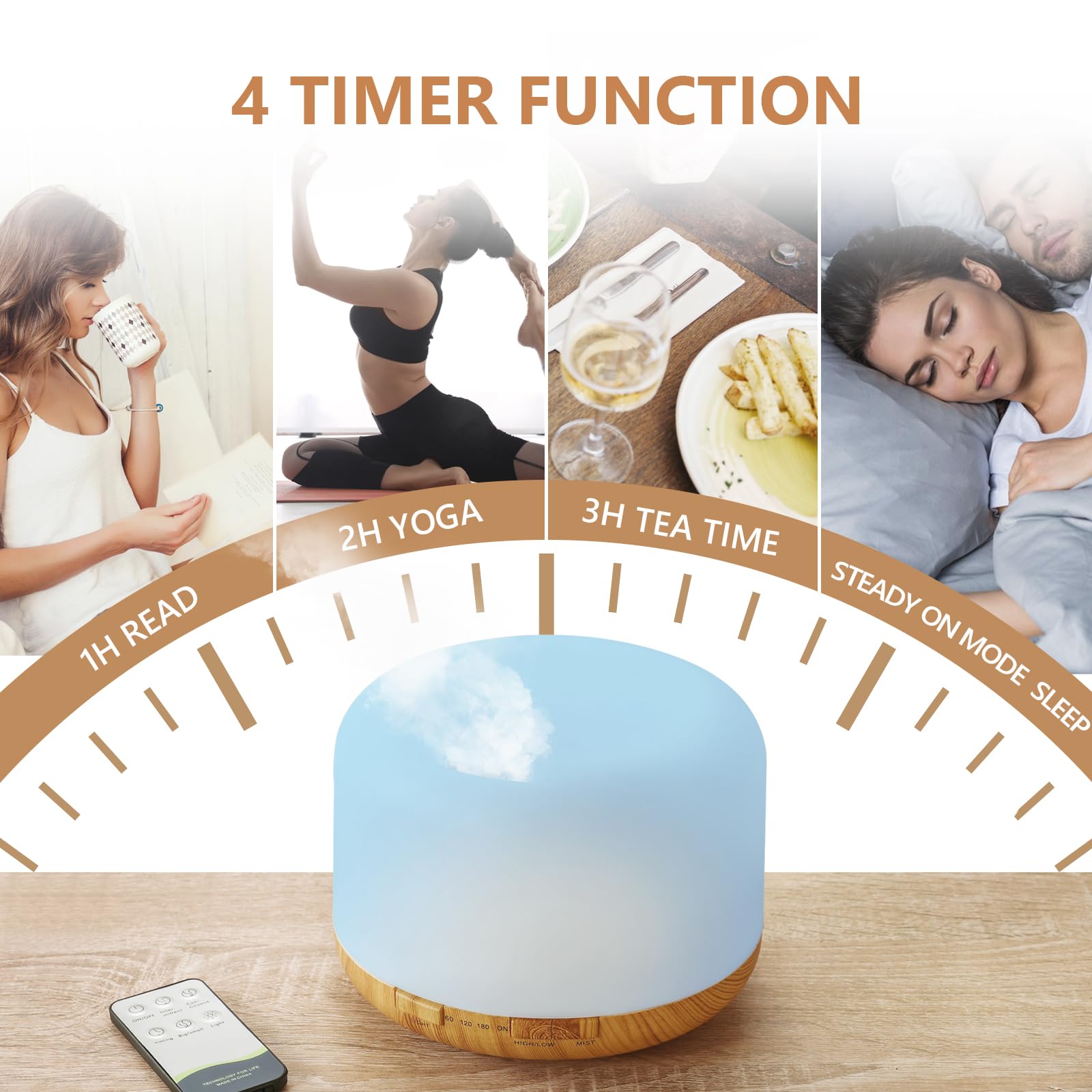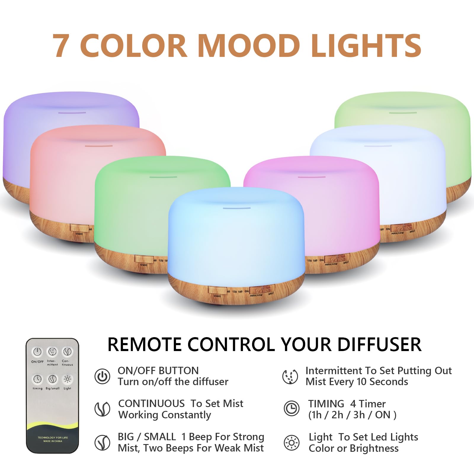 【Easy to use & Simple to Operate】Our diffuser comes with an easy to use remote control that can control it from up to 16.5 feet and change the lighting and misting modes as well as set the humidifier's timer. The LED light can be fixed or cycled through. The diffuser has 60/120/180 minute timers and steady ON mode. You can also set intermittent mist via the remote control.