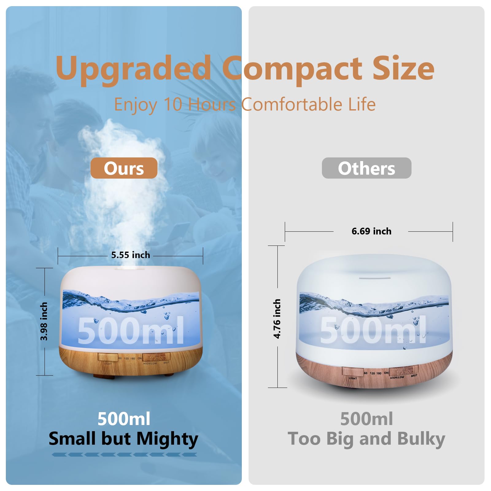 【Humidifier & Night Light】This ultrasonic essential oil diffuser is an amazing multi-functional aromatherapy device. You'll get one 500ml large capacity and easy to clean essential oil diffusers. It’s great to fit for the room, home, office and everywhere you want to put it.