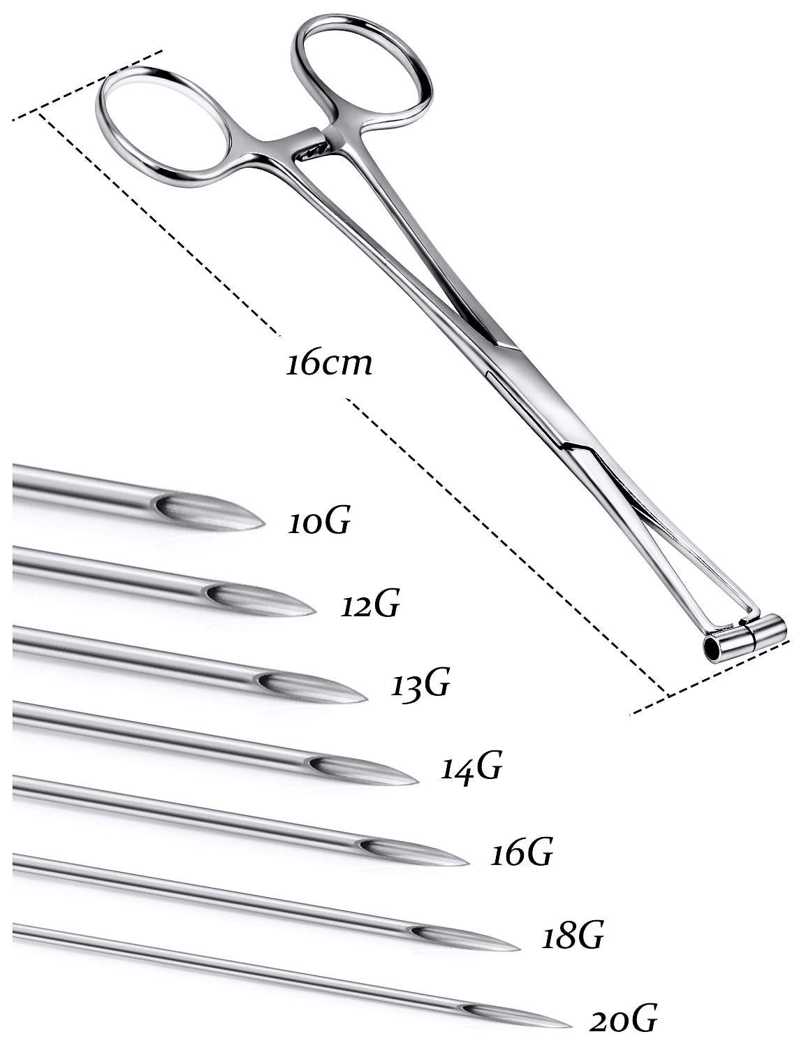 [PRODUCT SIZE]: Forceps Piercing Clamps Piercing Tools: 155mm=6.1inch, Piercing Needles: 20G 18G 16G 14G 13G 12G 10G Each Size 2pcs, Piercing Jewelry: 20G 16G 14G.