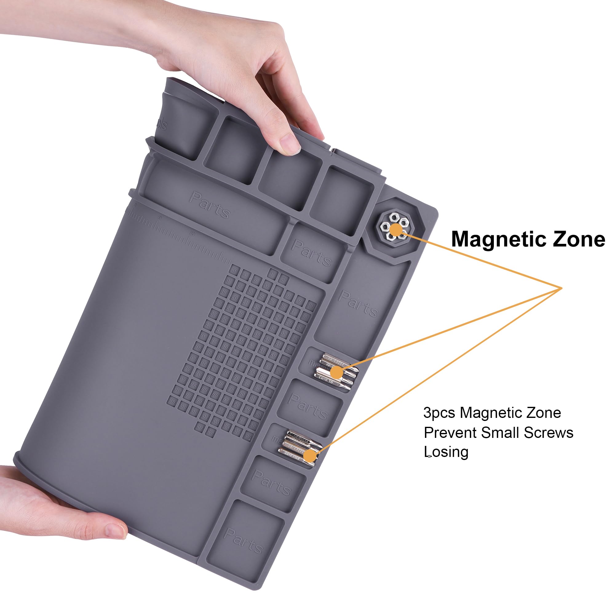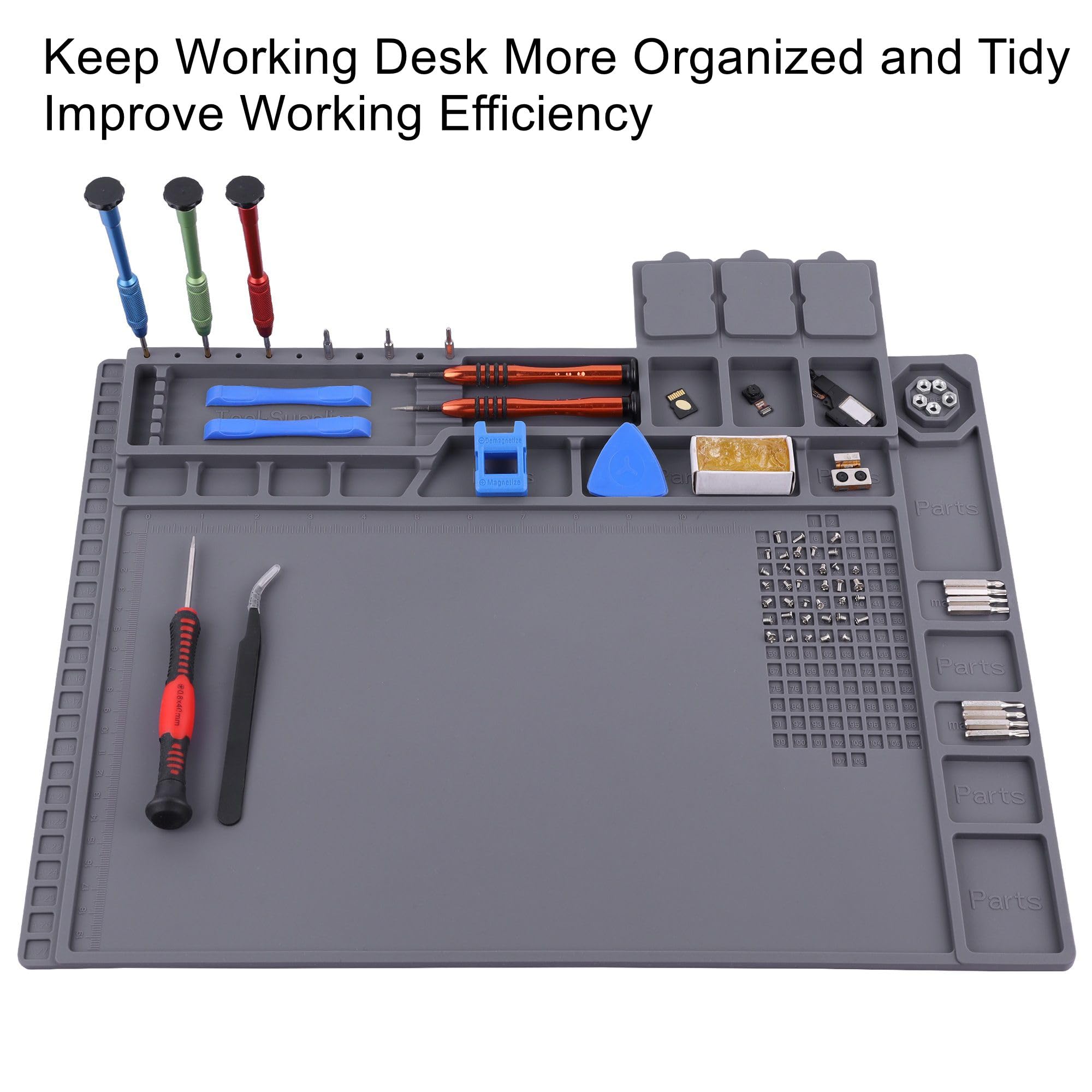 🥇-【Keep Your Platform Clean and Tidy】 The Soldering work mat come with built-in compartments, trays, and magnetic areas to hold small components, tools, or screws. This feature helps you keep your work area organized and prevents the loss of small parts. It also saves time and improve efficiency by keeping everything you need within reach, that no need to search for tools or components during the soldering process.