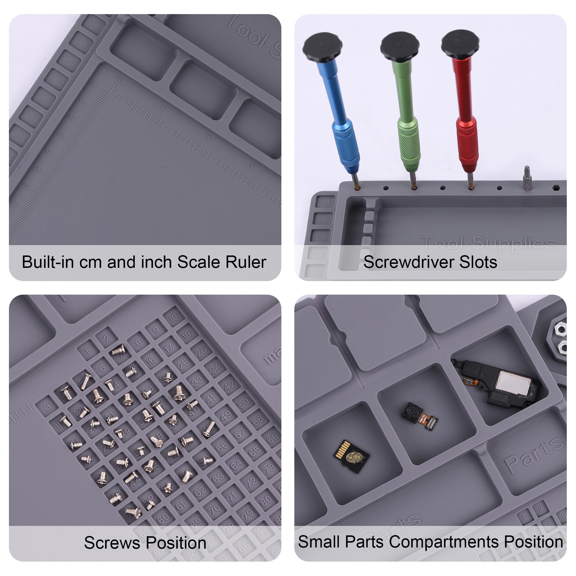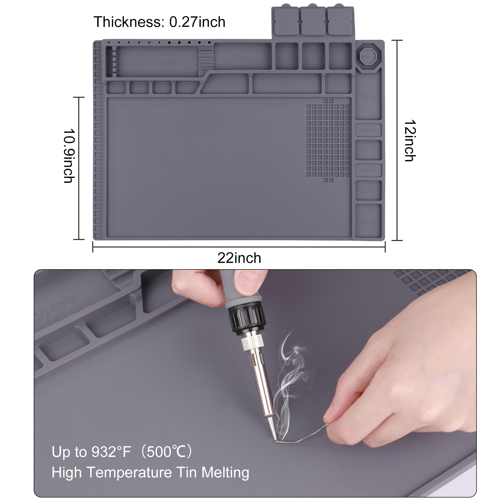 🥇-【Non-toxic Odorless and Non-Slip】Silicone material for soldering mat is 100% food grade which meet USA FDA standard, non-toxic and odorless. Both surface and back side of the silicone work mat are non-slip, it won't slide around on your desk. This ensures precise and stable soldering, reducing the chances of mistakes or damage to your work.