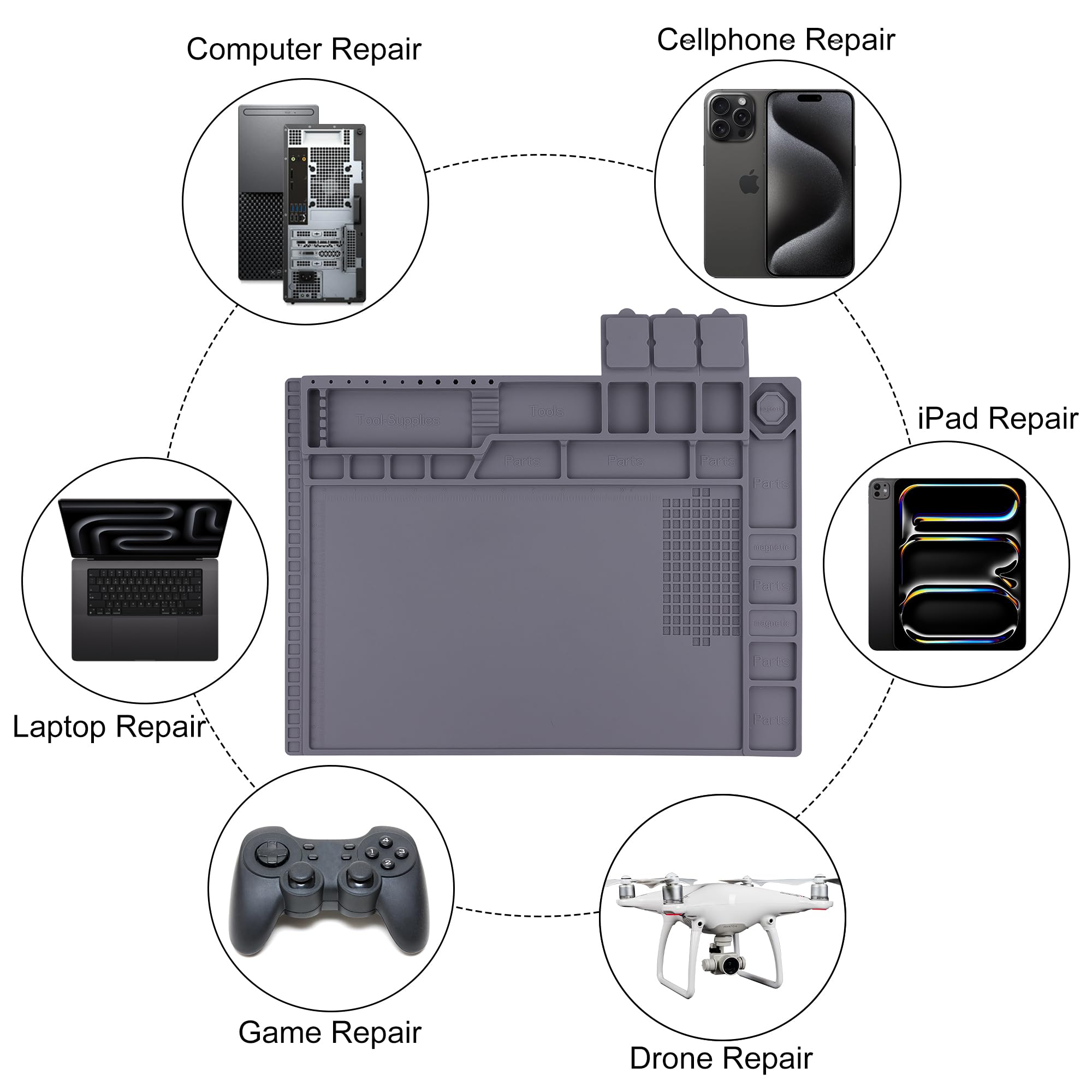 🥇【Big Size Mat】 The large soldering mat with size 17.3’’ x 11.8’’(44cm x 30cm ) provide bigger space to satisfy your many projects repairing demands. .It is an ideal silicone repair mat for soldering electronics assembly or electronics and circuit board repair, like for cell phone, laptop, computer, sports watch, camera, smart toy, eyeglasses etc.