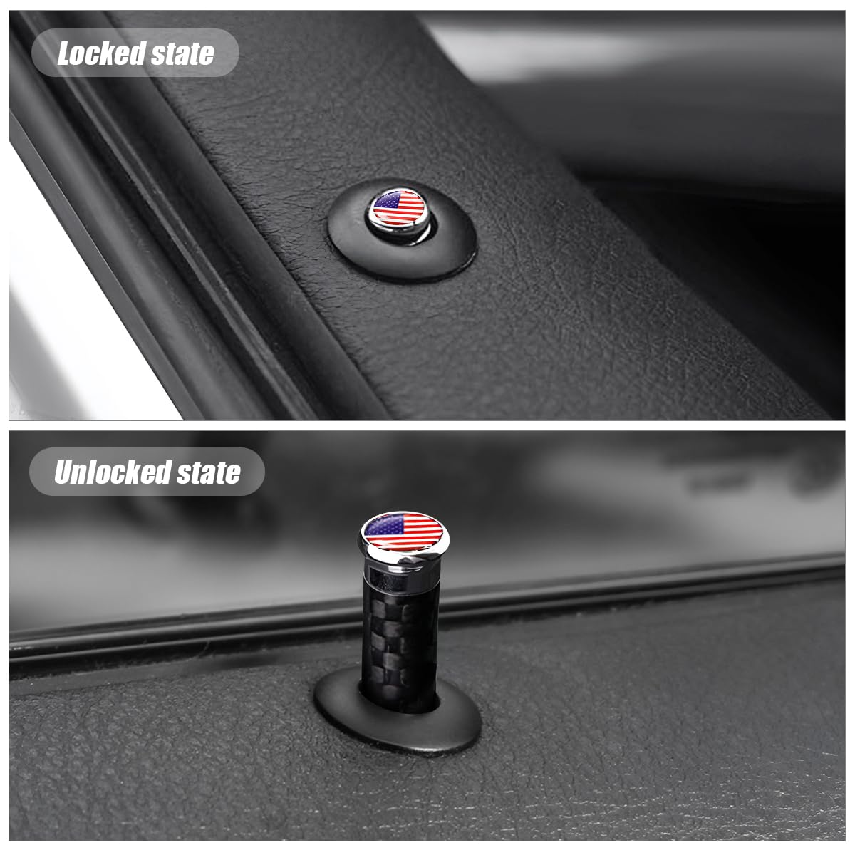 SPECIFICATION: - Condition: Brand New - Material: Carbon Fiber - Place on vehicle: Front, Rear, Left, Right - Size: 1.37 x 0.31 inches HOW TO INSTALL: - Take out the original door bolt. - Put the new one into the pillars. - Press the door lock pin down to the bottom and check if it is done. ABOUT US: - Our main mission is to make your vehicle more comfortable for daily and long drives, taking a mess and stress out of your life. Enjoy Your Driving With Our Car Accessories. - Please feel free to contact us at first if there is any problem when you receive or use our products. We are always here to support you.