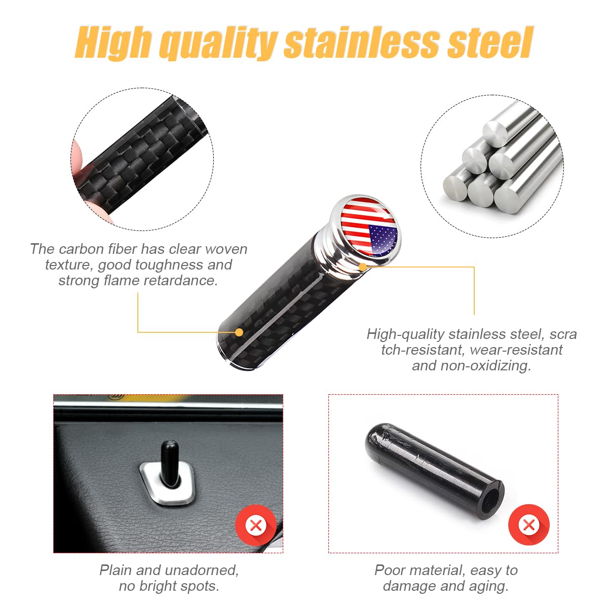 【Carbon Fiber & Copper】: Our door lock pin cover is made of reliable carbon fiber and copper, which is very light and durable. The bolt cap part is made of automotive grade plating technology, which is very smooth and bright and will never fade. The tough material allows it to effectively resist corrosion without deformation or fracture.