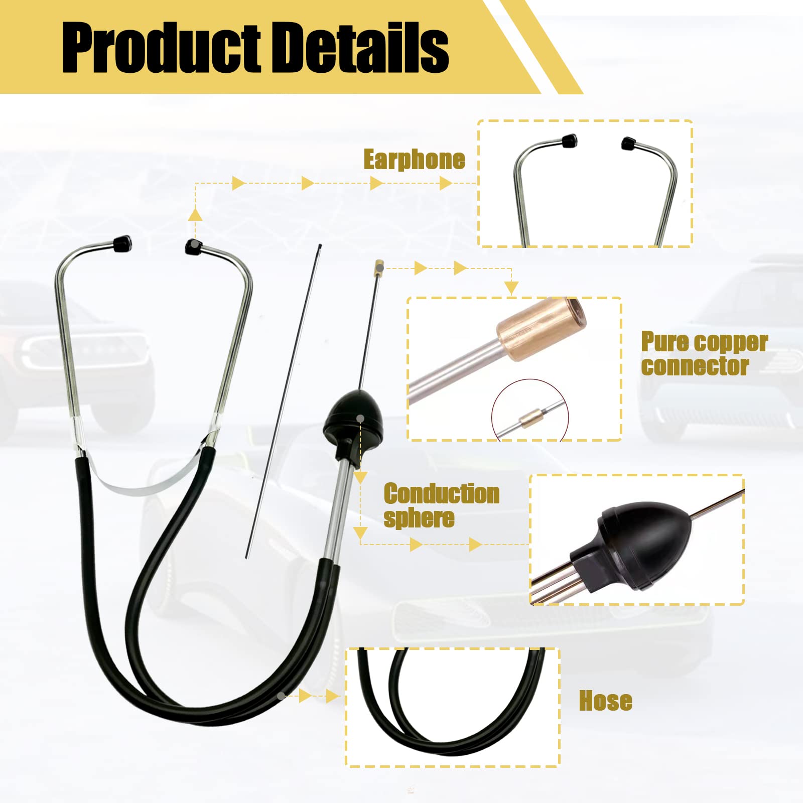 【Applicable to】Auto Stethoscope Engine Diagnostic Tool is ideal, suitable for identify broken gaskets, bad pulleys, damaged gears, defective valves, water pump failures, and other defective or damaged parts that cause odd noises and faulty operation, safe to use.