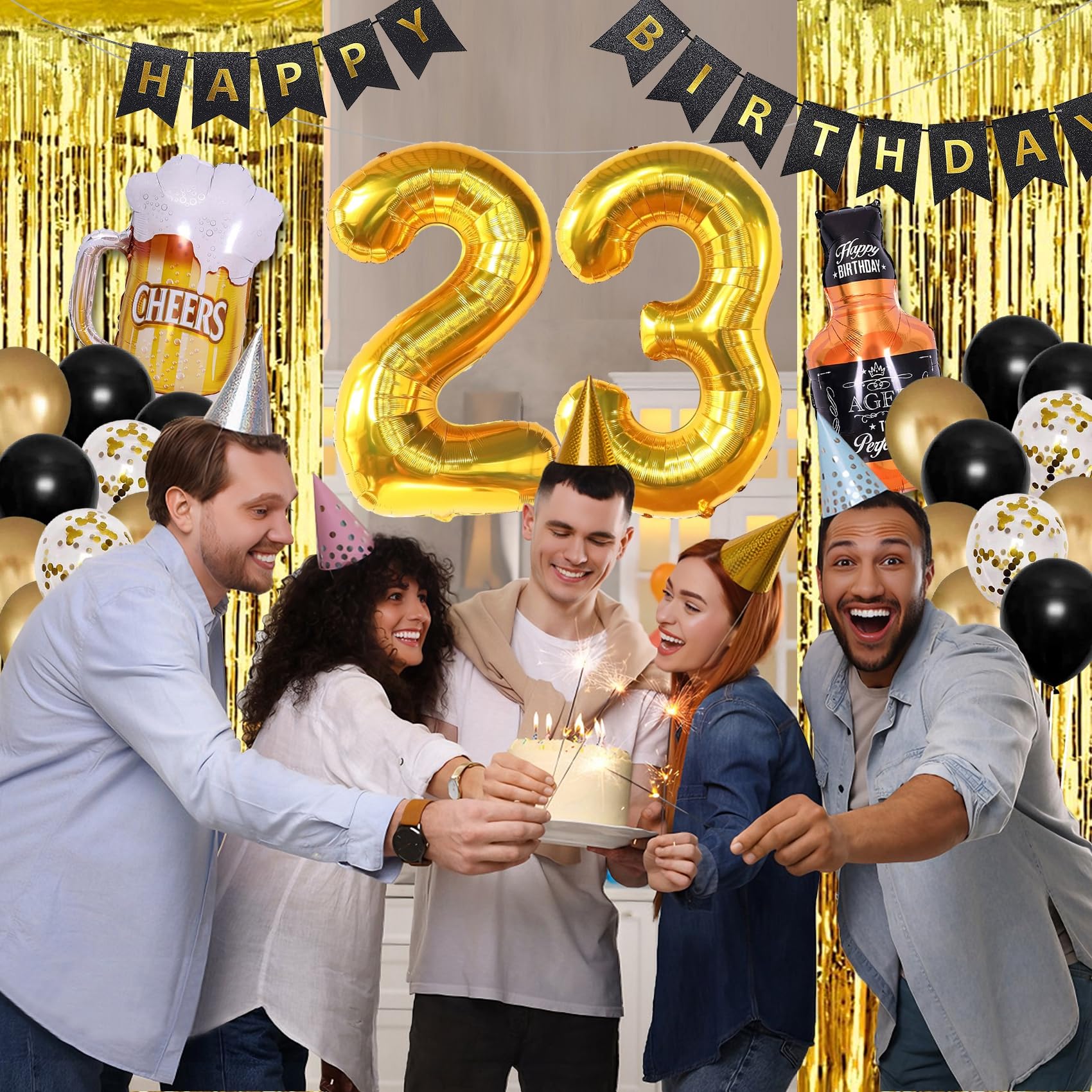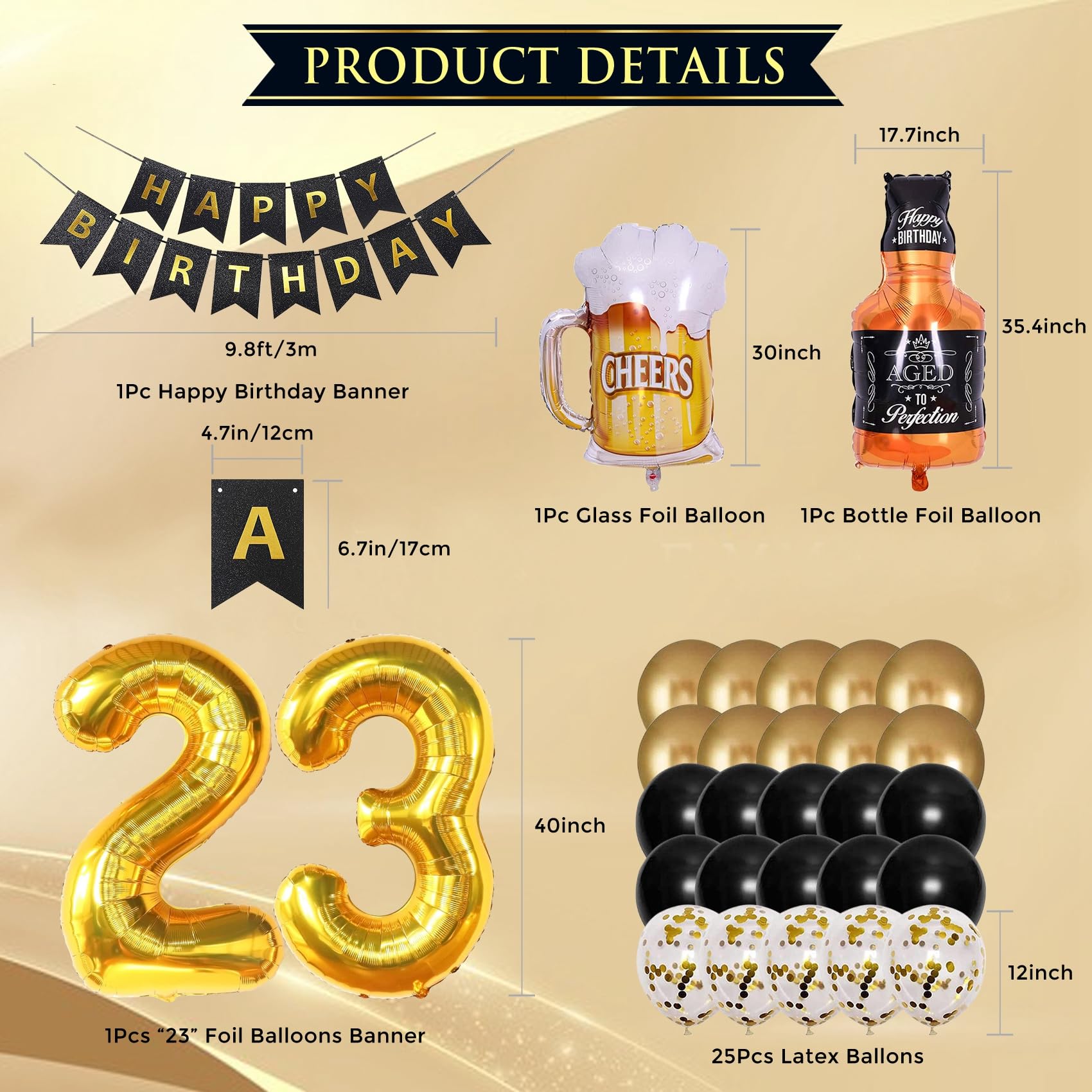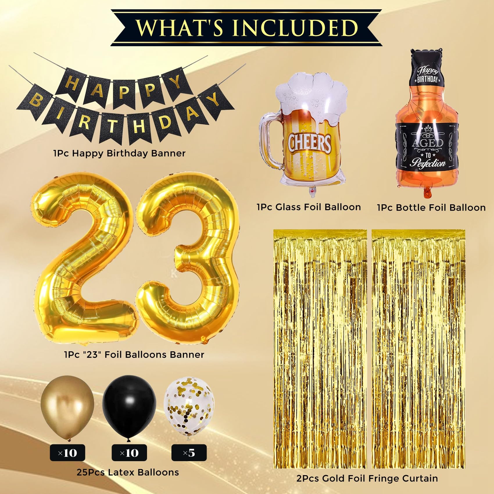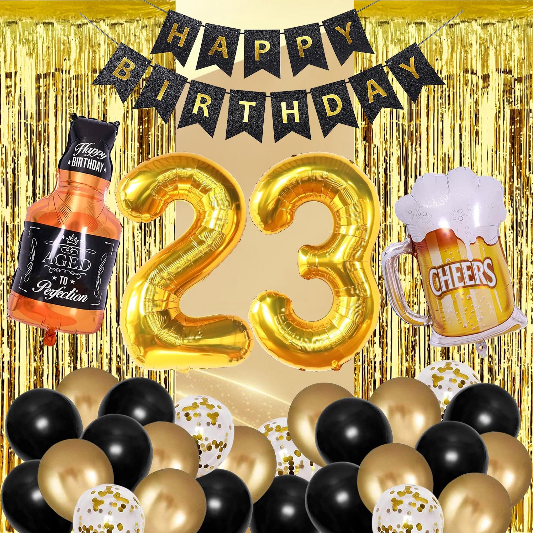 Included in your purchase: 1Pc "23" Foil Balloons Banner 1Pc Bottle Foil Balloon 35*17.7inch 1Pc Glass Foil Balloon 30inch 1Pc Happy Birthday Banner 25Pcs Latex Balloons(10pc Metallic Black,10pc Metallic Gold, 5pc Gold Confetti) 2Pcs Gold Foil Fringe Curtain (3.2ft x 6.5ft ) Make his 23rd birthday unforgettable with our "Happy 23 years old Birthday party Decorations for Men" set! This complete decoration kit is designed to add a touch of elegance and fun to any celebration. Perfect for men, our decorations are crafted to create a sophisticated party atmosphere that will leave lasting memories. Our set includes everything you need to make his special day truly remarkable. You'll receive a stylish "Happy 23rd Birthday" banner, 23 balloon numbers, and a variety of other decorations to complete the look. Each item is made from high-quality, durable materials to ensure they last throughout the celebration and beyond. Setting up is a breeze with our easy-to-assemble kit. Spend less time worrying about decorations and more time enjoying the party. The banner and balloons come with hanging accessories, making it simple to create a stunning display. Whether you're planning a grand birthday bash or an intimate gathering, our versatile decorations are perfect for any setting. Designed specifically for men, this set combines elegance with a fun vibe, making it ideal for celebrating this important milestone. Celebrate his 23rd birthday in style with our "Happy 23rd Birthday Decorations for Men" set. Order now and make his special day one to remember!