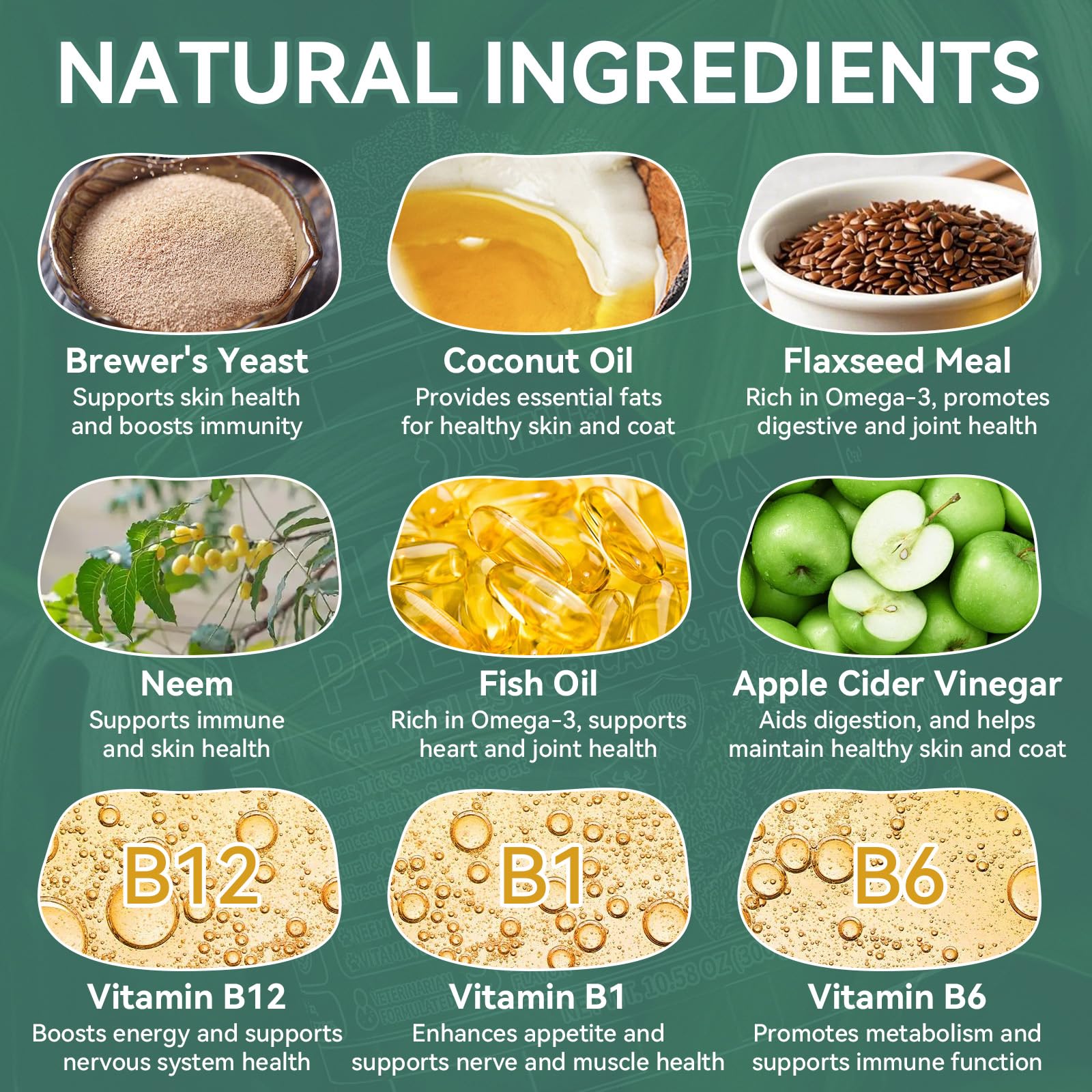 Safe & Natural Ingredients: Our flea and tick prevention for cats chews are made with soft chews rich in coconut oil, flaxseed, neem, and brewer’s yeast—ingredients that are perfect for your cat's daily supplement. Free from harsh chemicals or artificial additives, they provide natural and effective protection while enhancing your cat's skin resilience. These flea and tick treatment for cats are safe for both kittens and senior cats, offering a gentle yet effective flea prevention solution.