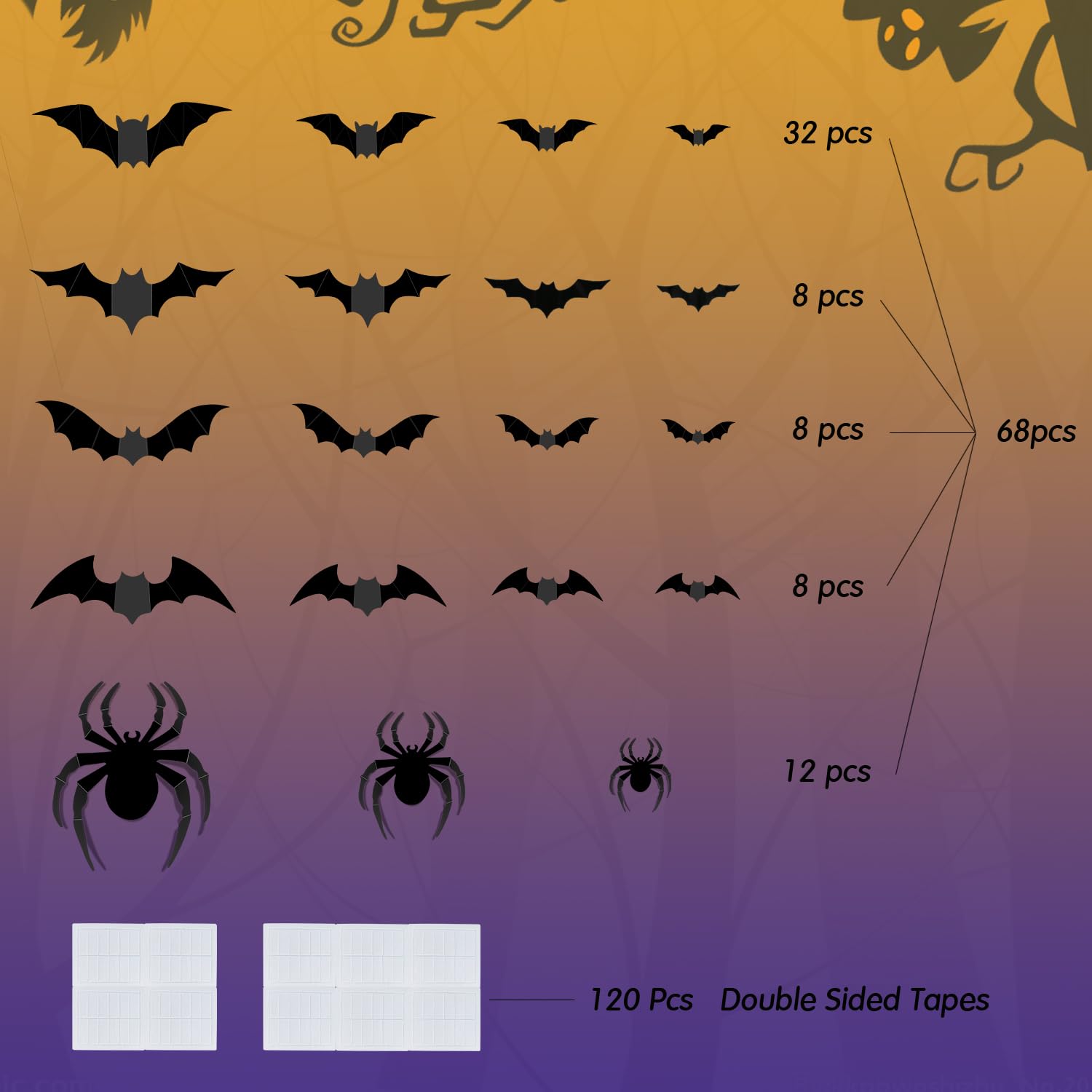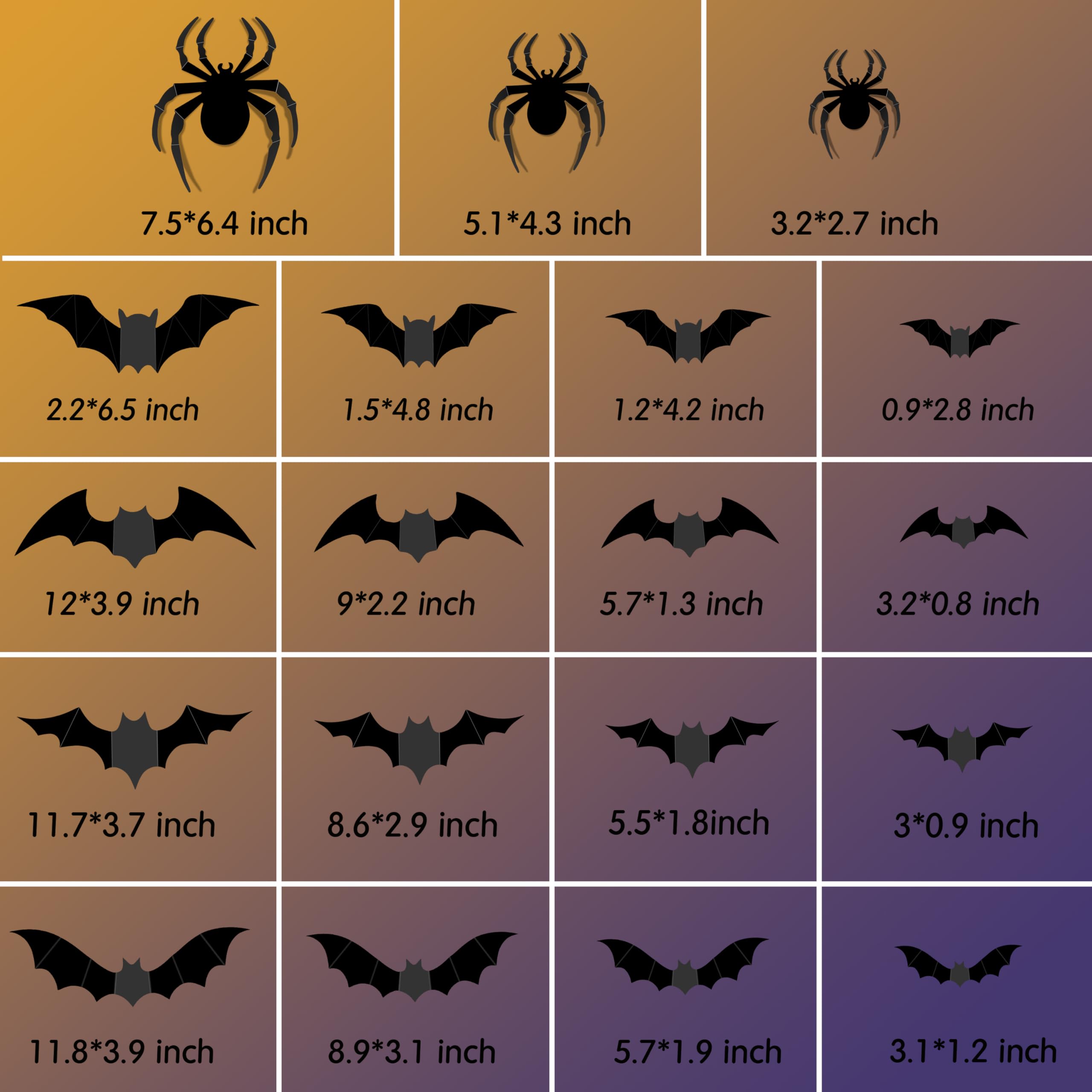 3-D Plastic Bats Spiders Stickers 68 PCS:These Bats Stickers set came with 4 different shapes and 56 Pcs bats Stickers together,big bats,medium bats,small bats. The largest bat size is about 12x3.9 inches, the smallest size is about 2.8x0.9 inches.These Spiders set came with 4 Pcs 7.5x6.4 Inch,4 Pcs 5.1x4.3 Inch and 4 Pcs 3.2x2.7 Inch.Bats Spiders Stickers add a great spooky accent to Halloween month!You can get creative with these halloween Stickers