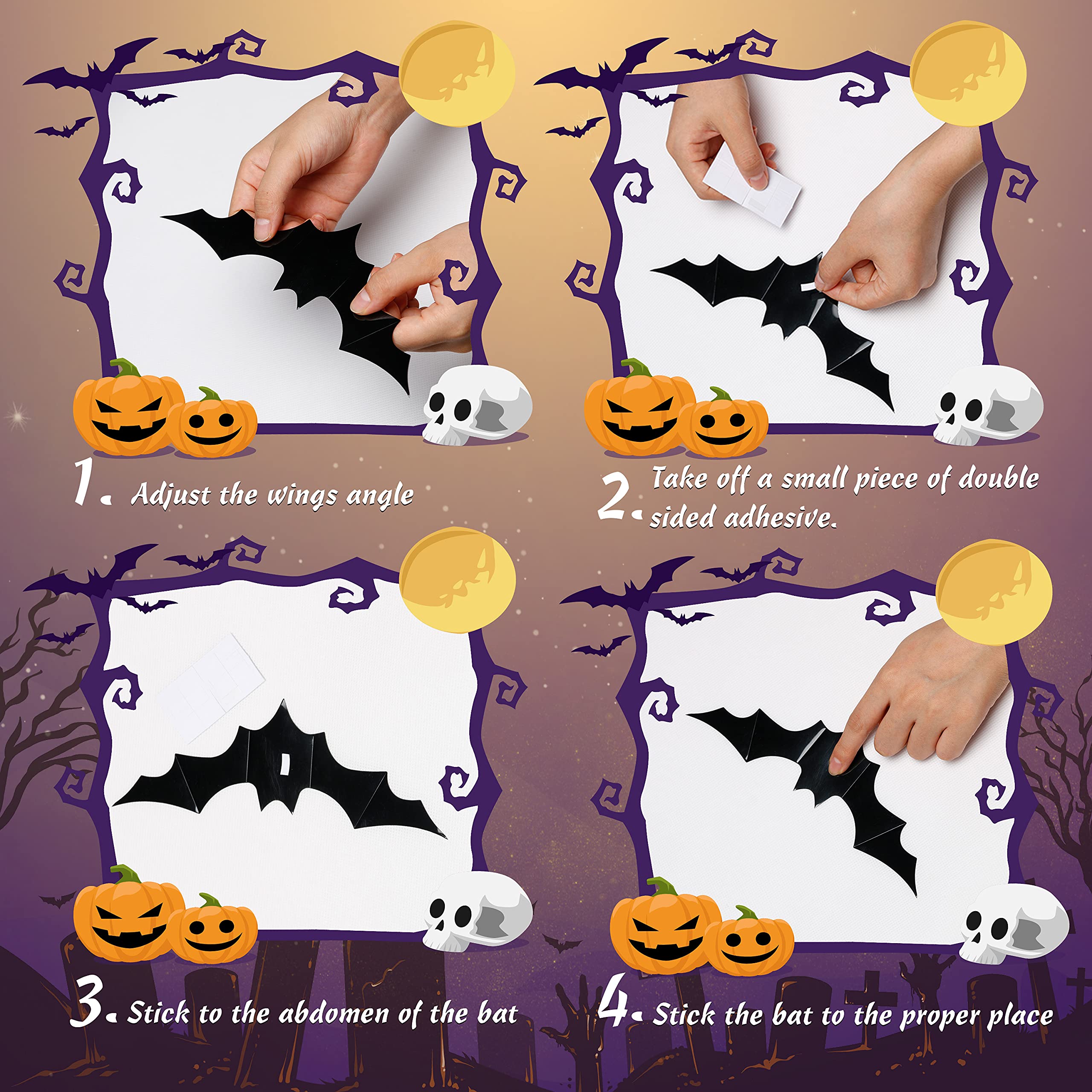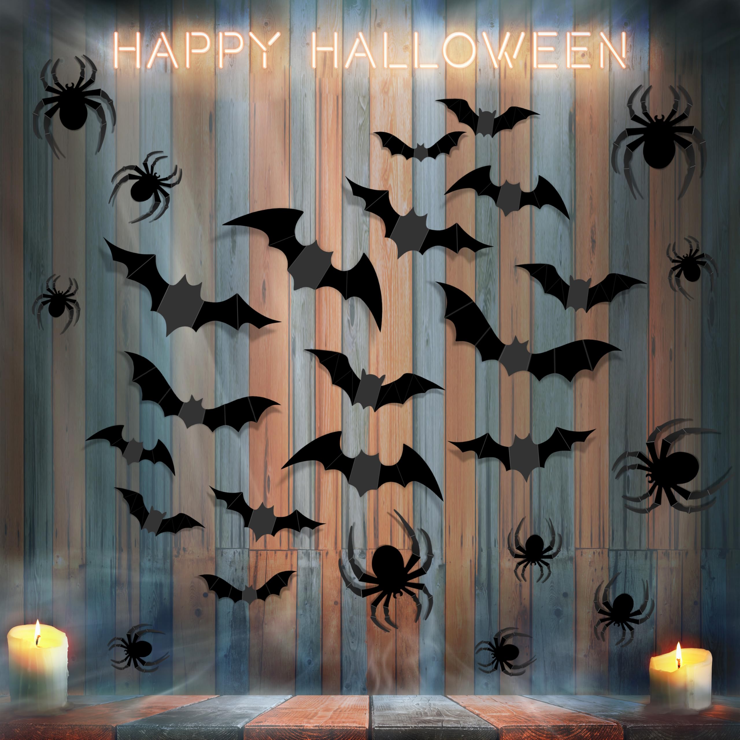 Easy To Put Up And Reusable:These Halloween 3D bat stickers and Spiders stickers decoration set is made of lexible plastic.You can shape the wing to bend more or less as the lines fold on the bat and spider.Give a more realistic 3-D look. Bats Stickers appears to be flying and spiders Stickers appears to walking. These bat and spider stickers comes with double sided tape which just pull it apart from the sheet and stick them anywhere. Durable enough quality to save and use again year after year