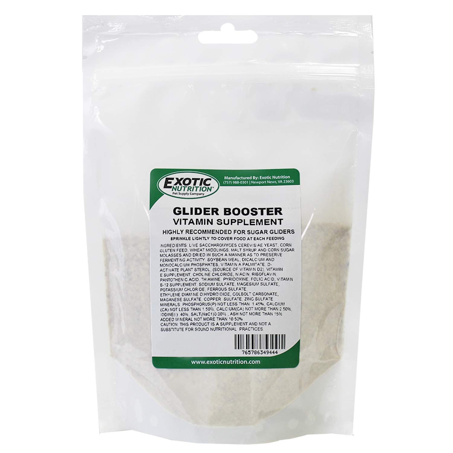 Exotic Nutrition's Glider Booster ensures that your sugar glider is getting the vitamins and minerals it needs to thrive. NET WEIGHT: 1.3 lb. FEATURES: ✔ HEALTHY - vitamin & mineral supplement for sugar gliders. ✔ NATURAL - all natural, human grade ingredients, with zero fillers, colors, or additives ✔ PROMOTES GUT HEALTH - Includes live saccharomyces yeast for a healthy digestive track. ✔ SUPPLEMENTAL - this is a supplement for when you are offering a homemade diet or varied diet where you are unsure of the nutritional analysis ✔ MULTI-USE - Great for breeding gliders, and also best during times of illness, travel, or other stressful situations. DOSAGE: Sprinkle a healthy pinch of booster over each serving of food (approx 1/8 of a teaspoon) INGREDIENTS: Flaxseed Meal, Soy Flour, Soybean Oil, Dicalcium Phosphate, DI-alpha-tocopheryl-acetate (Source of Vitamin E), Biotin, D-Calcium Pantothenate, Choline Chloride, Niacin, Pyridoxine Hydro-chloride, Retinyl Propionate (Source of Vitamin A), Cholecalciferol (Source of Vitamin D), Vitamin A Acetate (Source of Vitamin A), Vitamin B-12 Supplement, Thiamine HCI, Vitamin D Oil, Natural and Artificial Flavors CAUTION: THIS PRODUCT IS A SUPPLEMENT TO AND NOT A SUBSTITUTE FOR SOUND NUTRITIONAL PRACTICES.