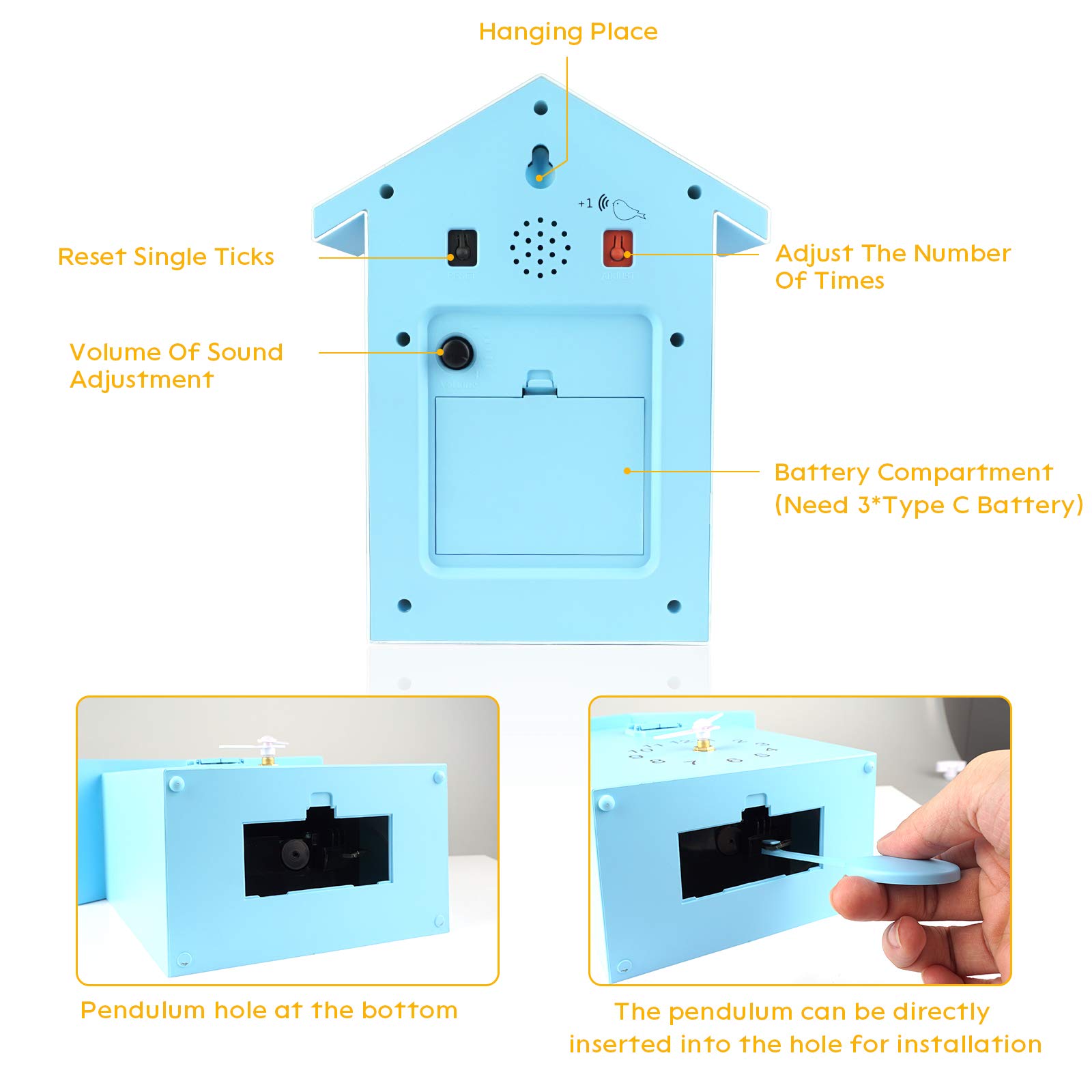 ◆EASY TO SET UP: put it on a shelf or mantle,The cuckoo clock is powered by battery (not included). We recommend using a carbon-zinc battery and replacing it twice a year for optimal performance.Open the lid on the bottom,place one AA battery inside,then pendulum will work.
