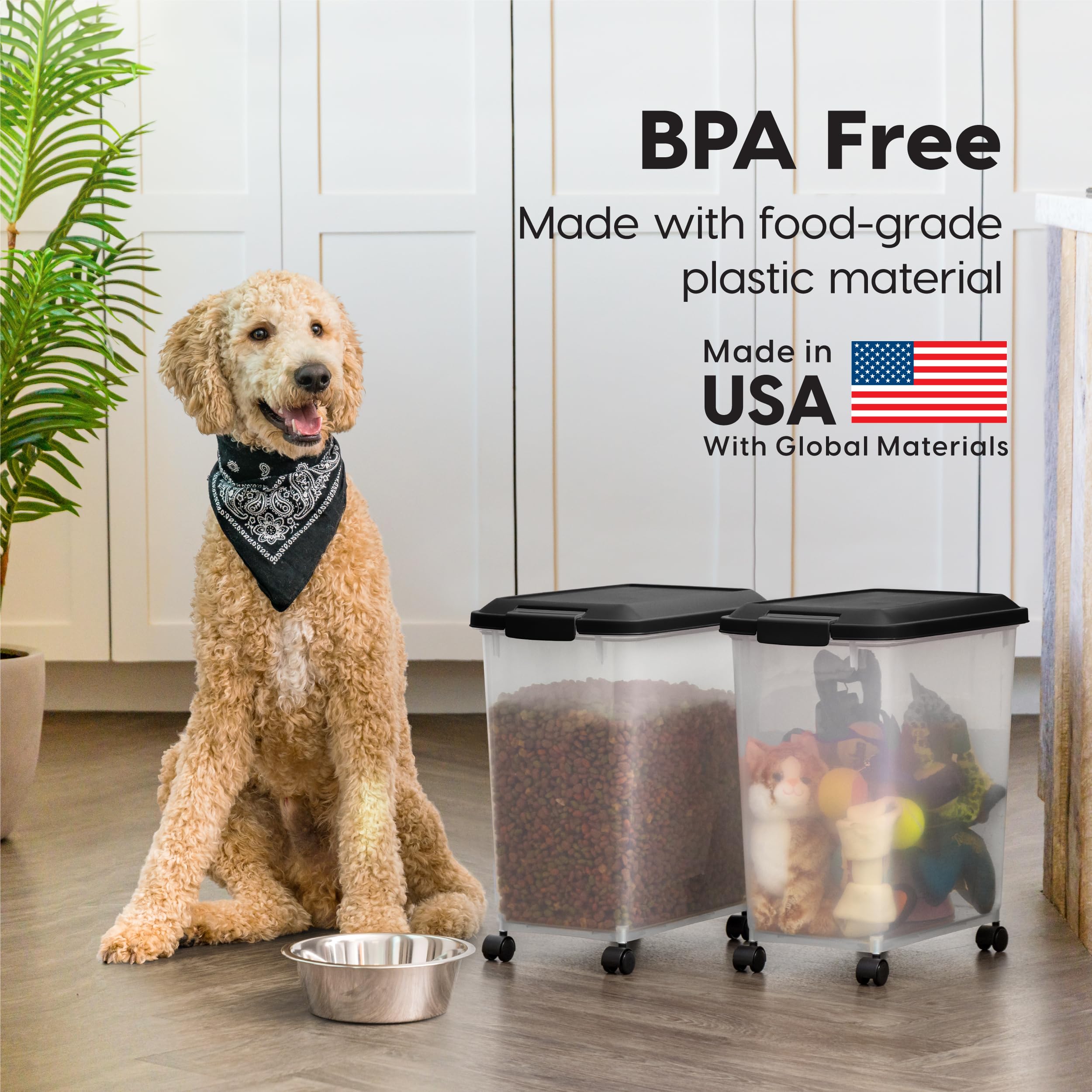 Meet the airtight container designed with your pet in mind. This 33-quart plastic airtight container is perfect for storing dog food, cat food, or any other pet food you wish to store. The sealed storage container features a foam seal and snap lock latches to keep contents fresh. Designed as pet food bins, these BPA free rolling storage bins offer many other uses as well such as leash and toy storage, pellet storage, grain storage, birdseed storage, cat litter storage, or even as a charcoal container. This IRIS USA airtight pet food container is translucent, versatile, functional, and the casters allow for easy mobility in any area of the house. Made in the USA.