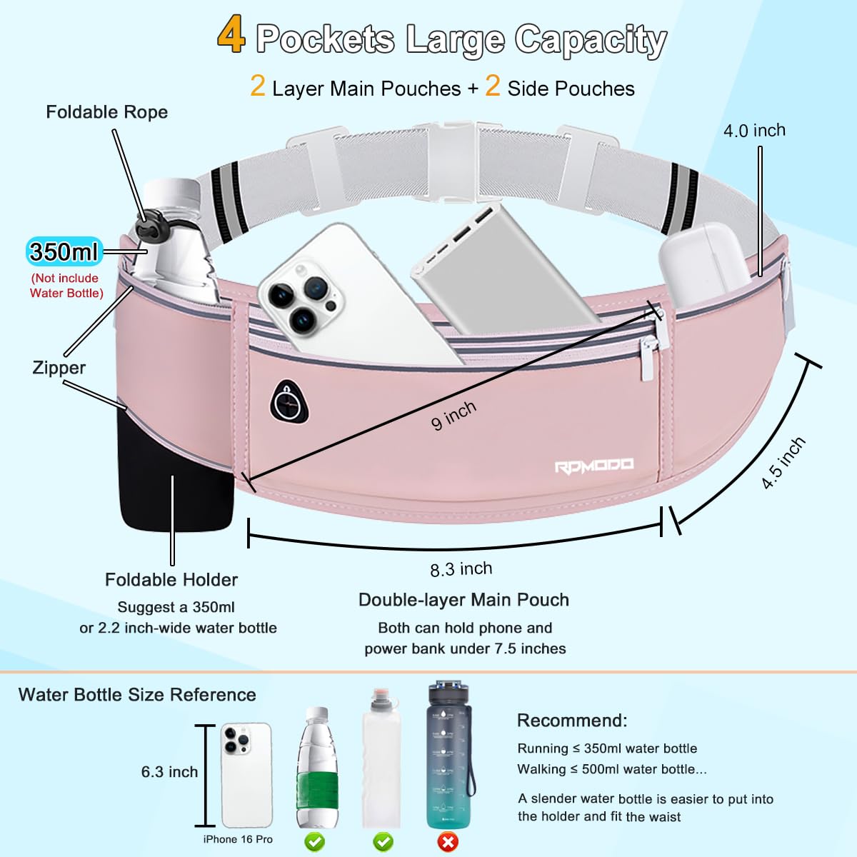【4 Pockets Large Capacity】The cell phone holder for walking has 4 pockets in total. 2 main pockets in the middle. The upper pocket is 4.0 x 8.0 in(HxL),and the lower pocket stretches from 3.5 to 4.6 x 8.0in(HxL). Both can hold phones or power bank under 7.5 inches. The 2 side pockets are 4.0 x 3.5in, for holding earphone, keys, cards, cash, tissues, etc. The running belt with water bottle is lightweight so you almost cannot feel it when you put it on.