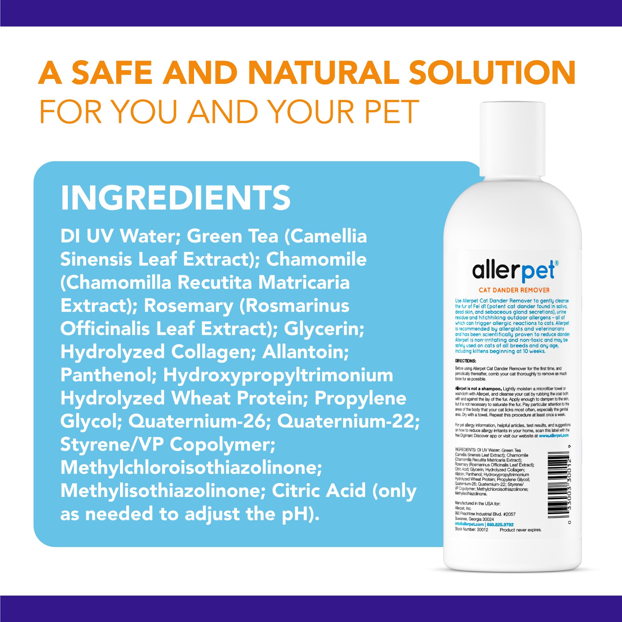Safe, Non-Toxic & Cat-Friendly – Made with natural ingredients like Green Tea, Chamomile, and Rosemary, Allerpet is fragrance-free, gentle on skin and fur, and safe for all cats (and even puppies). No harsh chemicals, no rinsing required.
