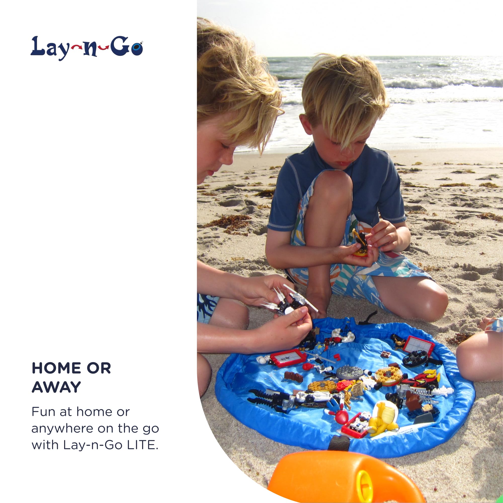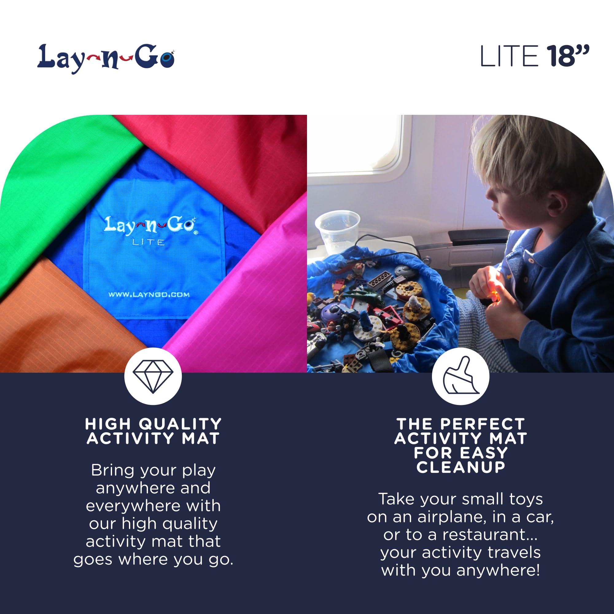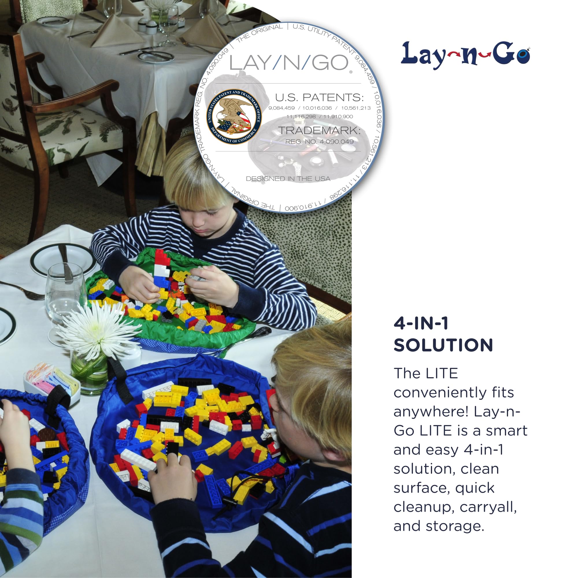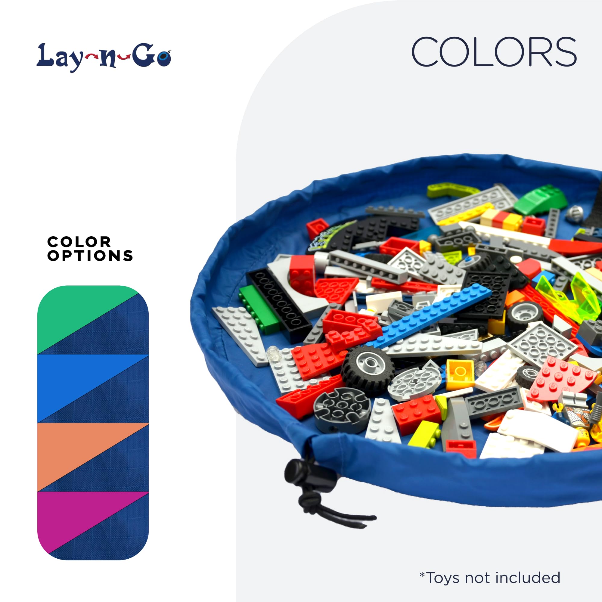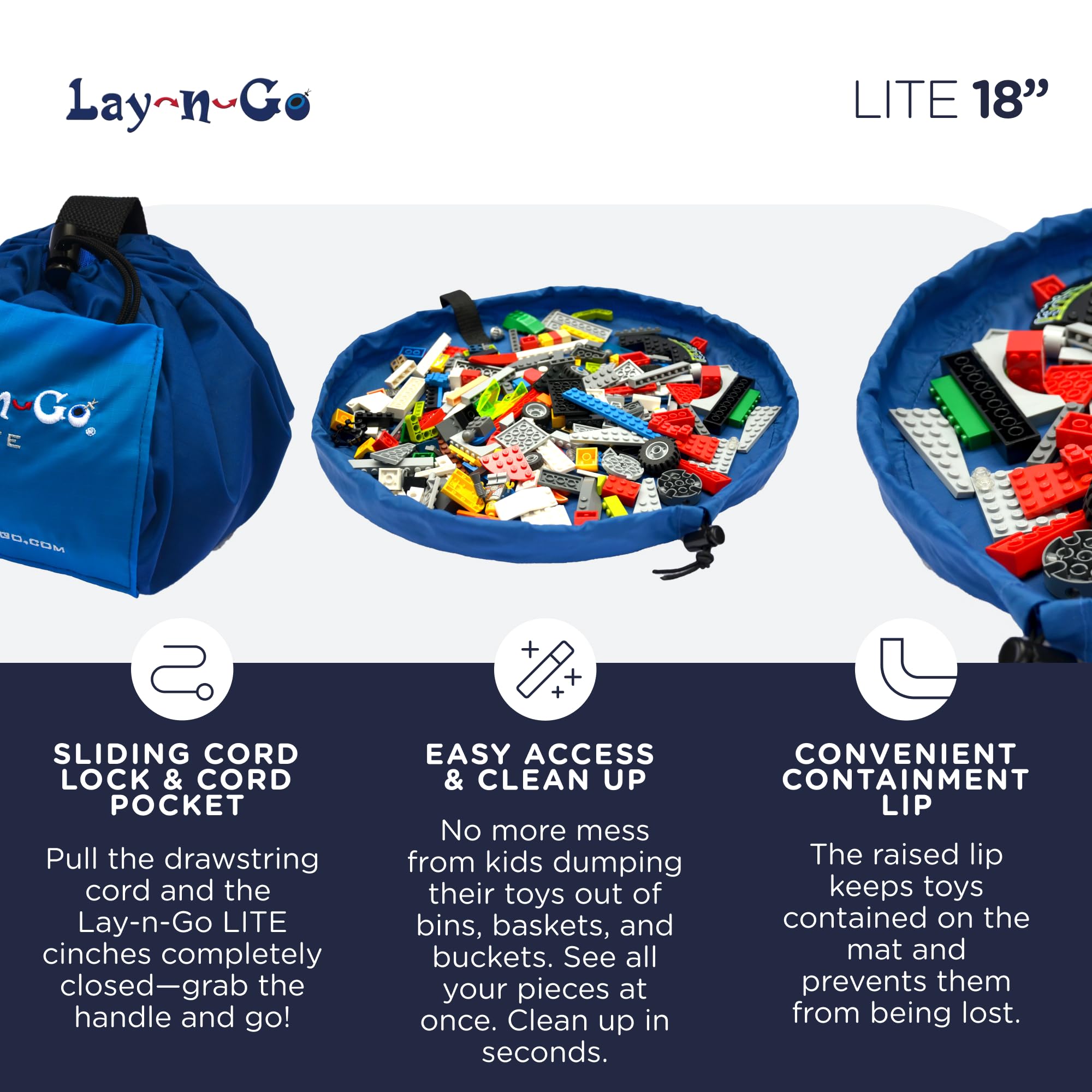 QUICK CLEANUP & EASY STORAGE: No more dumping toy bins and baskets. The Lay-n-Go 18” playroom toy organizer mat has a raised edge to keep your toys in place. Just pull the drawstring, and it turns into a bag that's easy to carry and store.