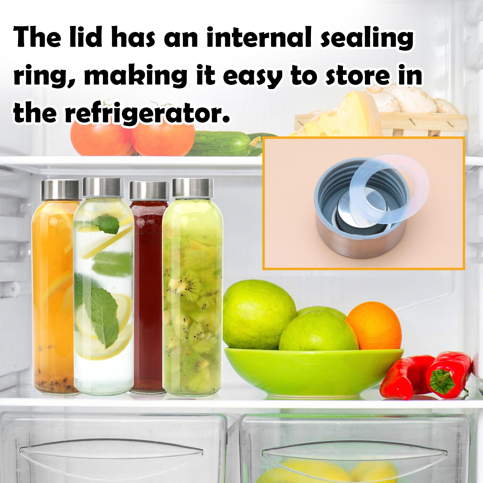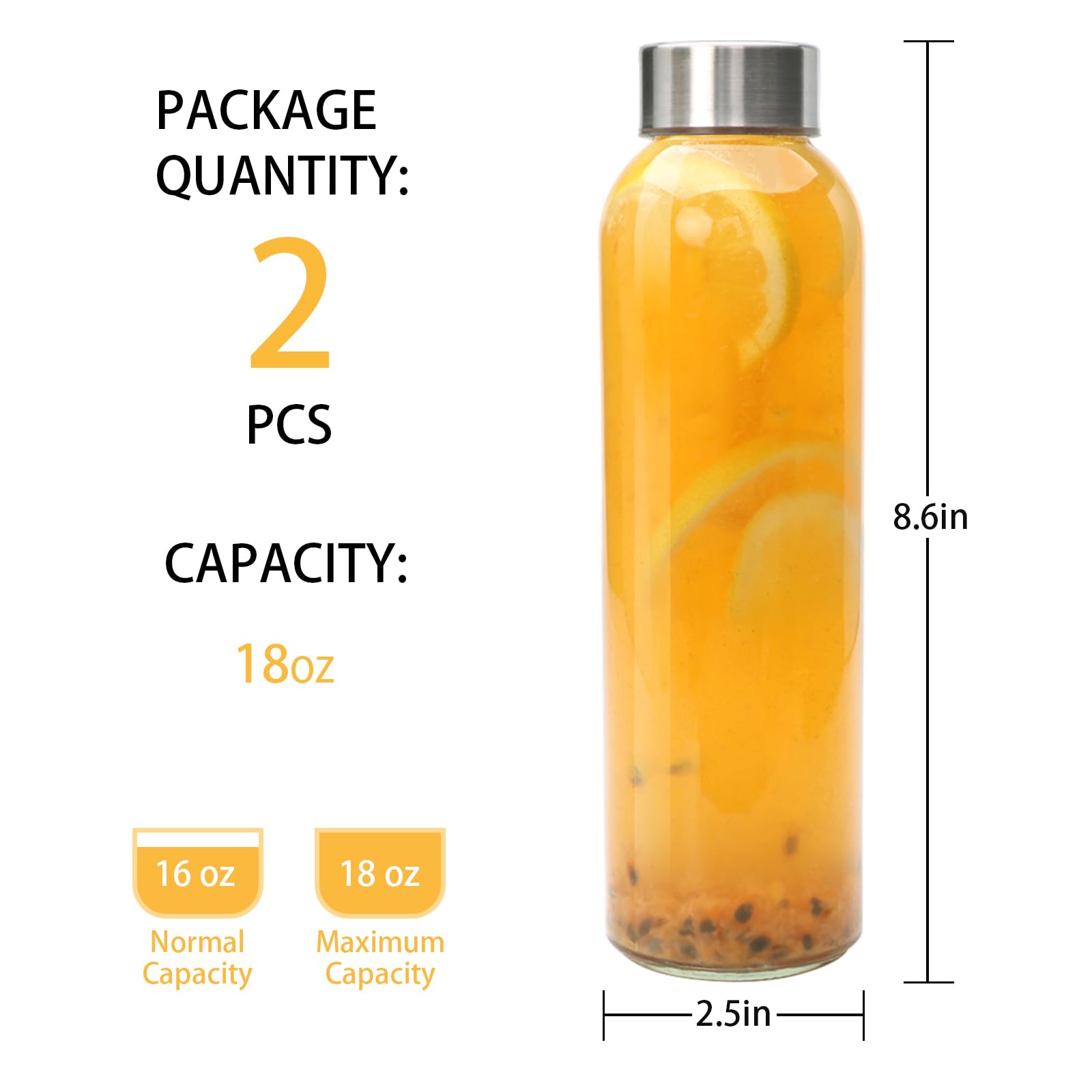 WIDE USAGES:Glass bottles for juicing and more.Leak proof stainless caps,Each cap is lined with a rubber ring,won't leak to ruin your juices drinks without any worry of spills.Put this glass water bottle in your bag or car and get a healthy start to your day with a juice, smoothie, brew, ice tea, iced coffee, nut milk, milkshakes, Kombucha or water.