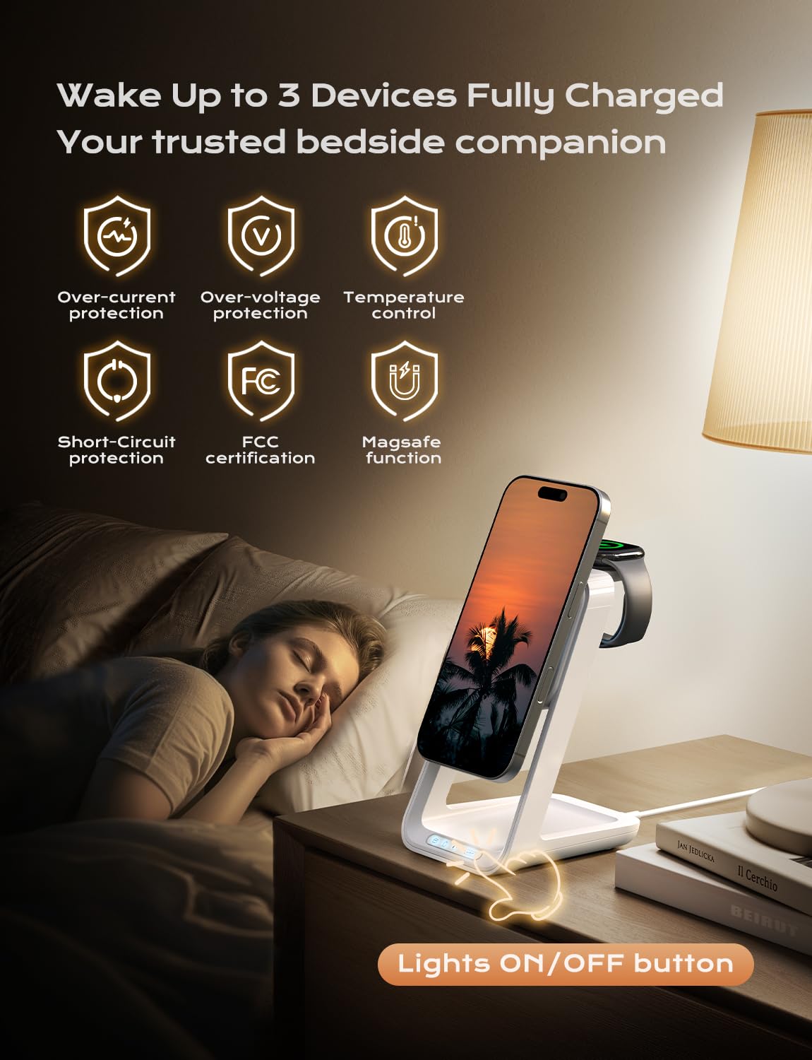 Premium Fast Charging – Equipped with a magnetic iPhone charger delivering up to 15W (7.5W for iPhone), plus 5W for earbuds and 3W for watch, this station fully powers your devices in about 3.2 hours. It automatically switches to trickle mode once charged, protecting battery health while ensuring safe, efficient, and reliable charging every time.