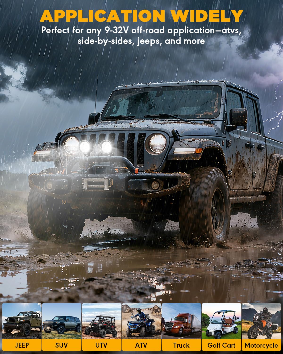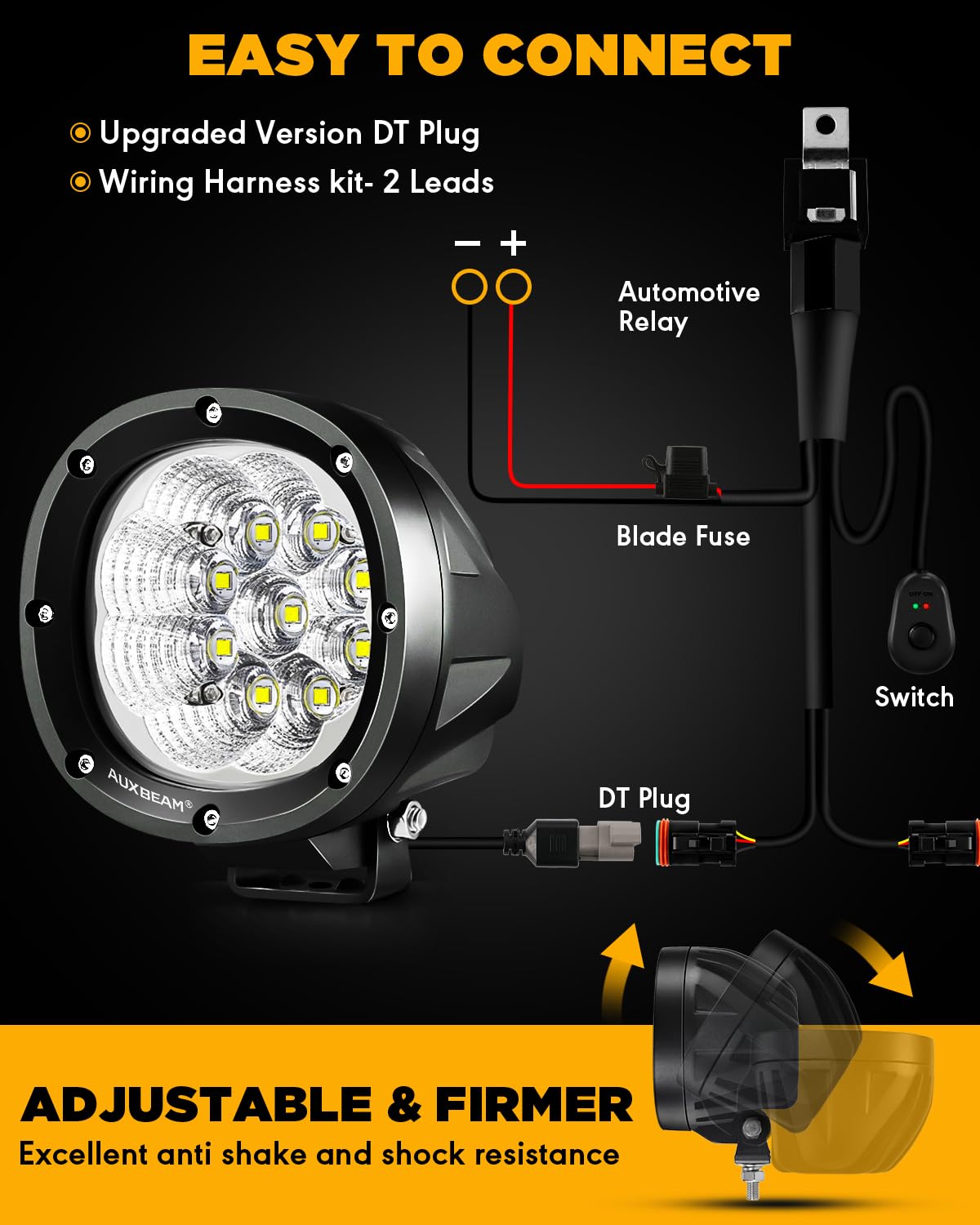 【EASY INSTALLATION & APPLICATION 】 Just plug & play. Operating voltage range between 9V-32V. With adjustable mounting brackets, this led driving light is well suited for Jeep, Toyota, Ford, Wrangler, Trucks,ATVs, UTVs, SUVs, and a variety of other vehicles.