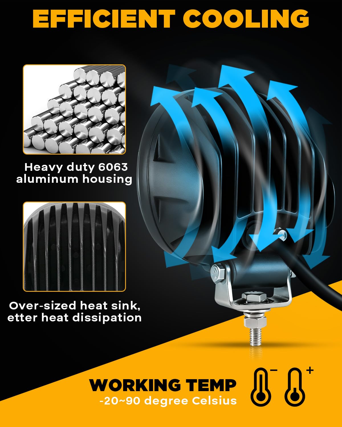 【LAST OVER 50,000 HOURS】Made of thickened 6063 diecast aluminum heat sinks, over sized heat-sink and breathing vent make lights fast running cooler. Even in harsh driving condition, it can still maintain an impressive 50,000 hour average life span.