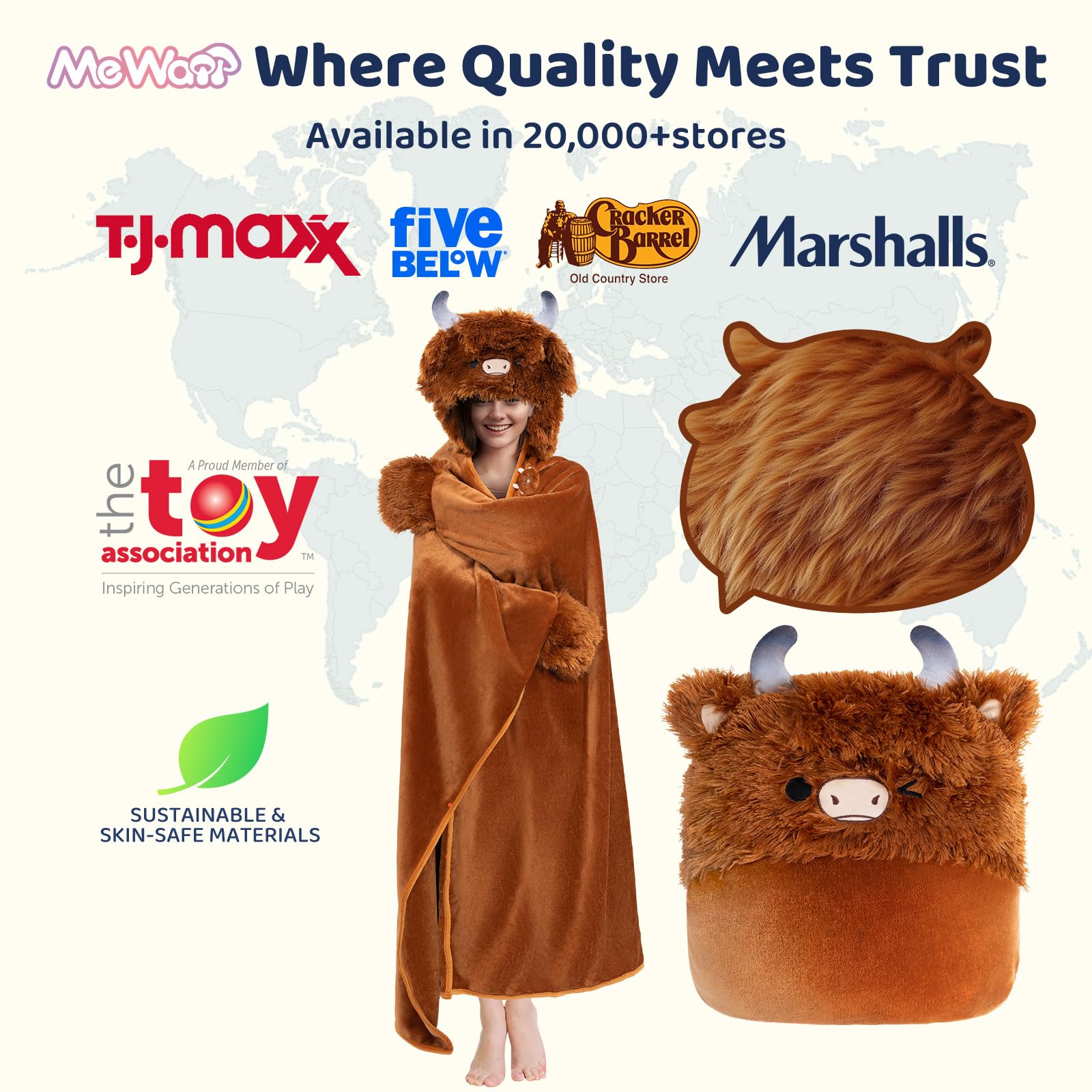 ONE SIZE FITS ALL: Our wearable highland cow blanket is thoughtfully designed to fit most shapes and sizes, making it perfect for everyone. With dimensions of 62" x 52", this oversized highland cow blanket provides full-body coverage and warmth, ensuring comfort from head to toe whether you're relaxing at home or on the go—another reason it’s the perfect highland cow gift.