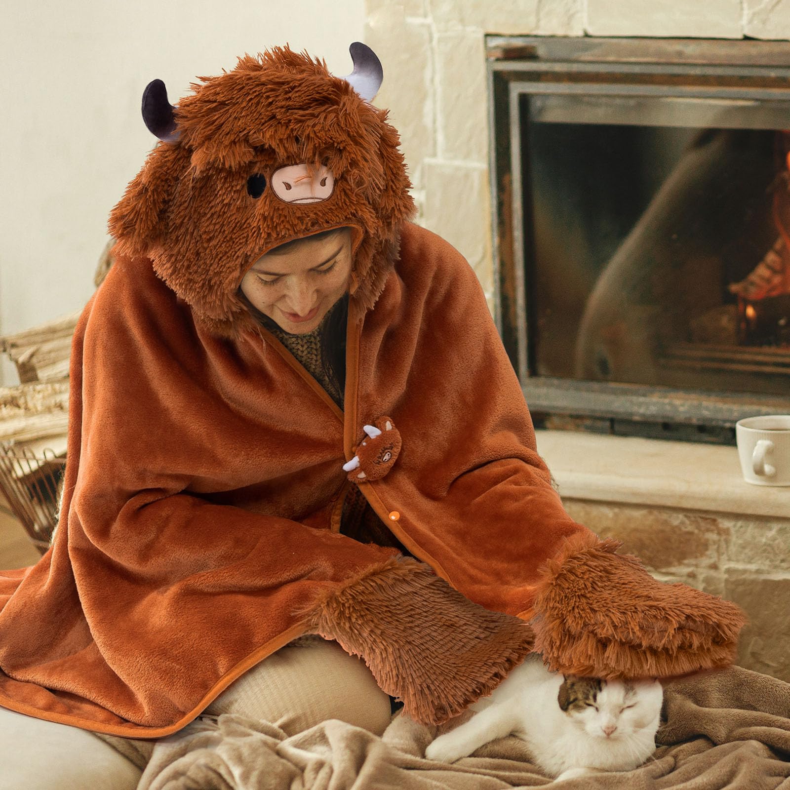 VERSATILE & HANDS-FREE DESIGN: Designed for both lounging and mobility, our oversized hooded highland cow blanket is perfect for any season. Featuring a button-up design, it allows you to move freely while keeping your hands free—ideal for sipping morning coffee, working from home, or enjoying a movie on the couch. It easily transitions from a cozy highland cow costume to a snug sofa blanket, making it an ideal highland cow gift for loved ones.