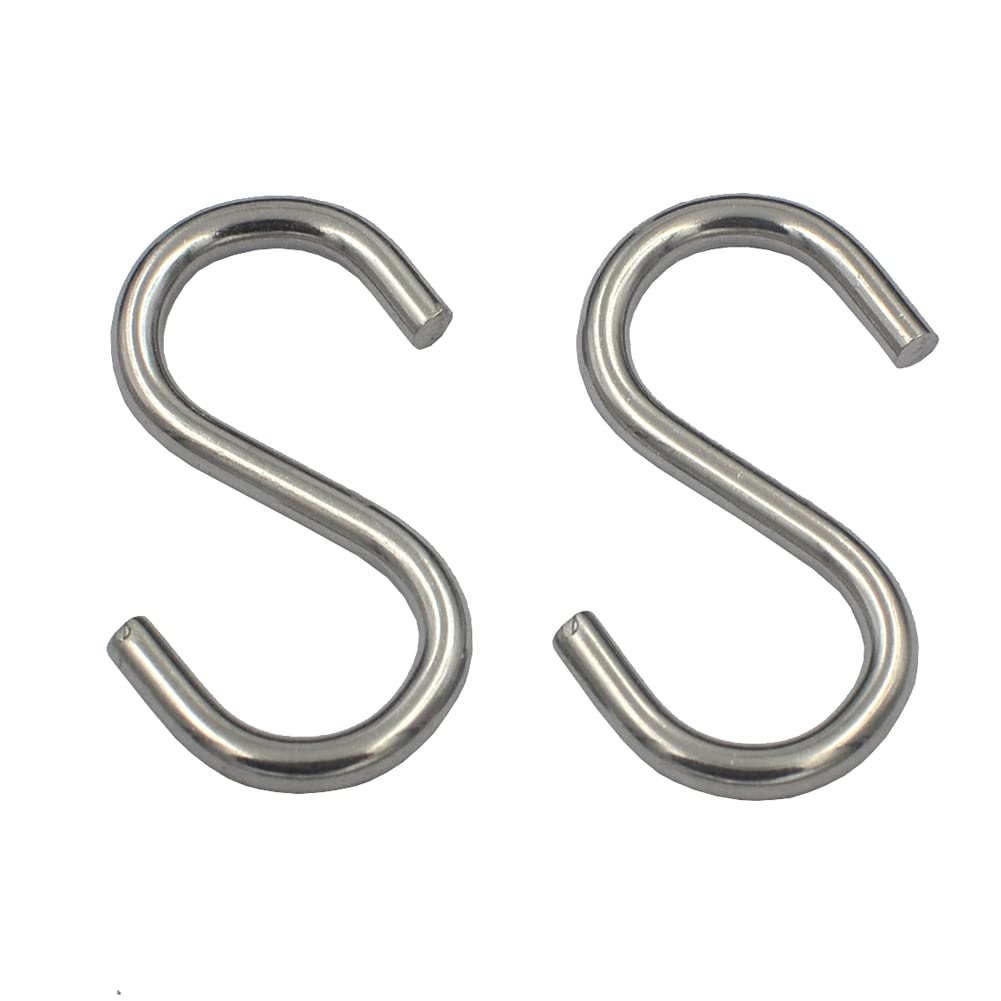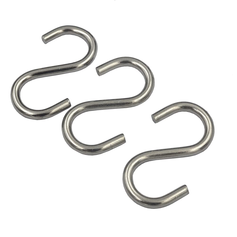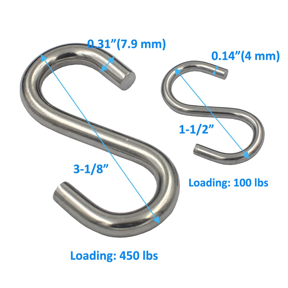 These are small size S hooks For light duty project, if you need for heavy duty use, pls choose other size S hooks in our store Material: 304 stainless steel, not iron or aluminum or 201 stainless steel Overall size: L*W=1-7/8" * 9/16" (48mm * 14mm), cable diameter is 0.16"(4mm) Detail size pls check picture we supply Quantity: 24 packs We have other sizes carabiner hooks with same design and quality Loading limit is 100 lbs(45 kg) Used to hang light weight item in the kitchen, at home, in the garden Also great for chains, ropes, camping, hiking, fishing, boating, indoor outdoor equipment gear, DIY accessories You have more choice to use at home,outdoor,in the garden We are supplying different material and size hooks, buckles, rivets, burrs, snaps, buttons. Also could supply stainless wire, cord, cable, quicklink and so on, you could find these in our amazon store"DGOL" Package include: 24 packs 1-7/8" long 304 stainless steel S hooks
