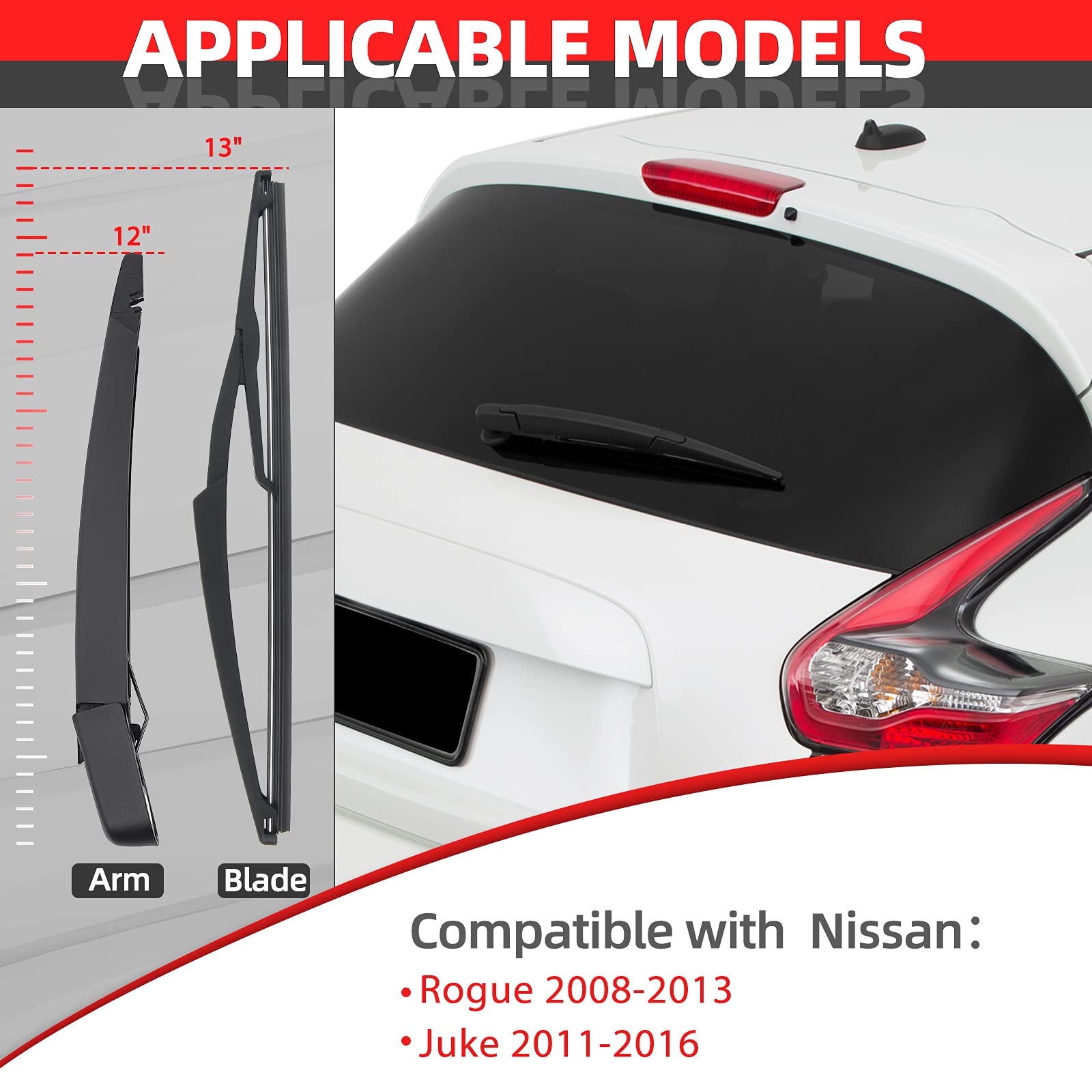 Fitment: Replacement for 2008-2013 Nissan Rogue, 2011-2016 Nissan Juke, 2008-2013 Nissan Qashqai rear windshield wiper arm and blade kits