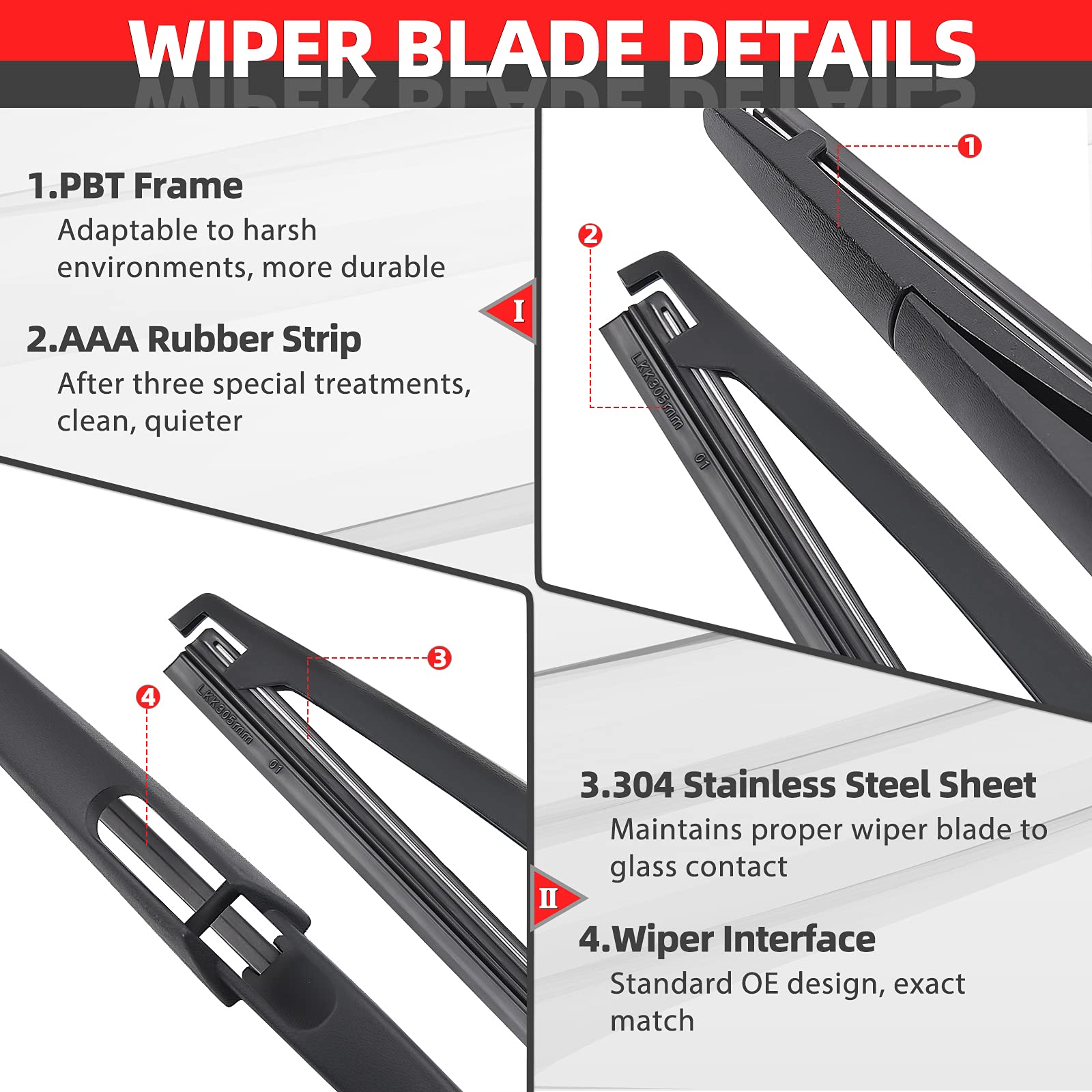 Material: Arm - use 100% PBT with 30% Pb, Blades - natural rubber, AAA level. Have precisely fitted wiper elements for smoother and quieter operation