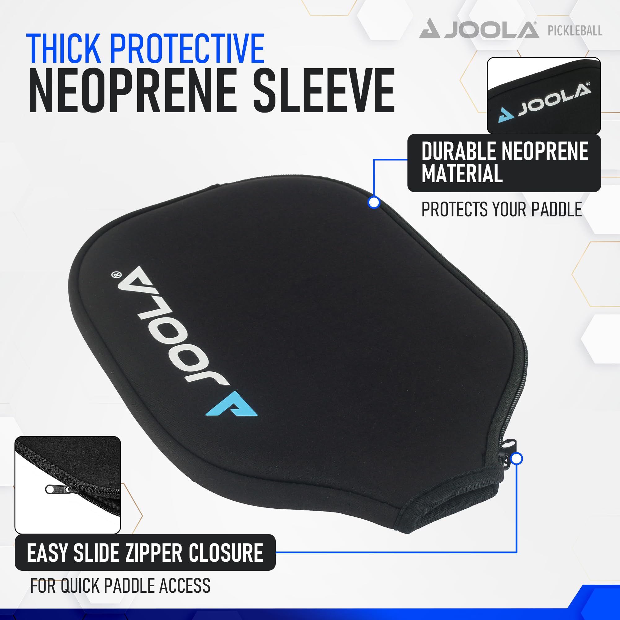The JOOLA Universal Pickleball Paddle Cover is a must for anyone who wants to extend the life of their paddle. Utilizing the cushioned protection of neoprene, the JOOLA paddle cover protects against the rubbing and scratches that can happen outside of play while in your pickleball bag. Plus, there is no need to measure, it covers all paddles made by JOOLA as well as almost all other pickleball paddles on the market. This includes paddles that have added pickleball lead tape, overgrips, and edge guards. Proven to fit on thick 16mm paddles while still giving a snug fit on thinner 10mm rackets. Great stocking stuffer or gift for pickleball players.