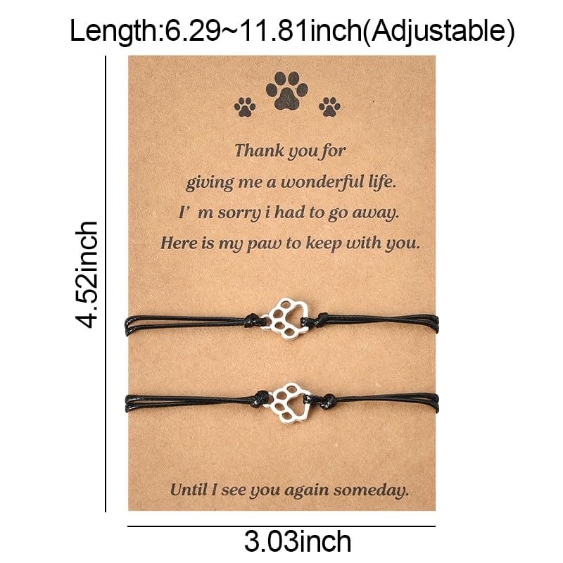 Description Product: paw print bracelet for women men 2pcs Length: 16-30cm Material: Metal This cat dog memorial bracelet for loss of dog cat can be used for special small gifts for dog cat lovers so that recipient can get a kick of them at first glance Also apply to dog lover gifts for boys girls, pet sympathy gifts for dogs cats, pet loss sympathy gifts for dog lovers, lost dog cat sympathy gift, pet memorial gift ideas etc, and our product is suitable for children over 4 years old