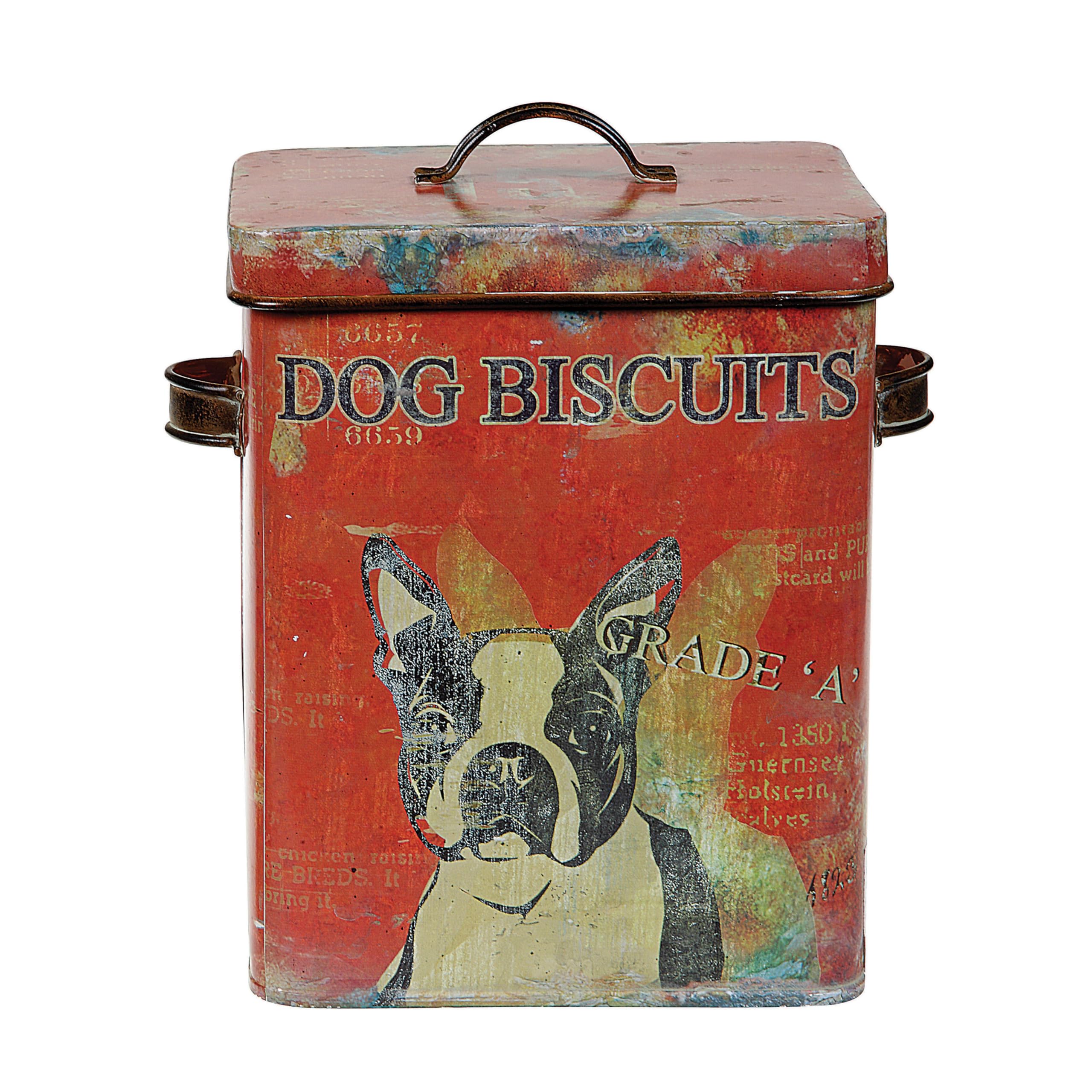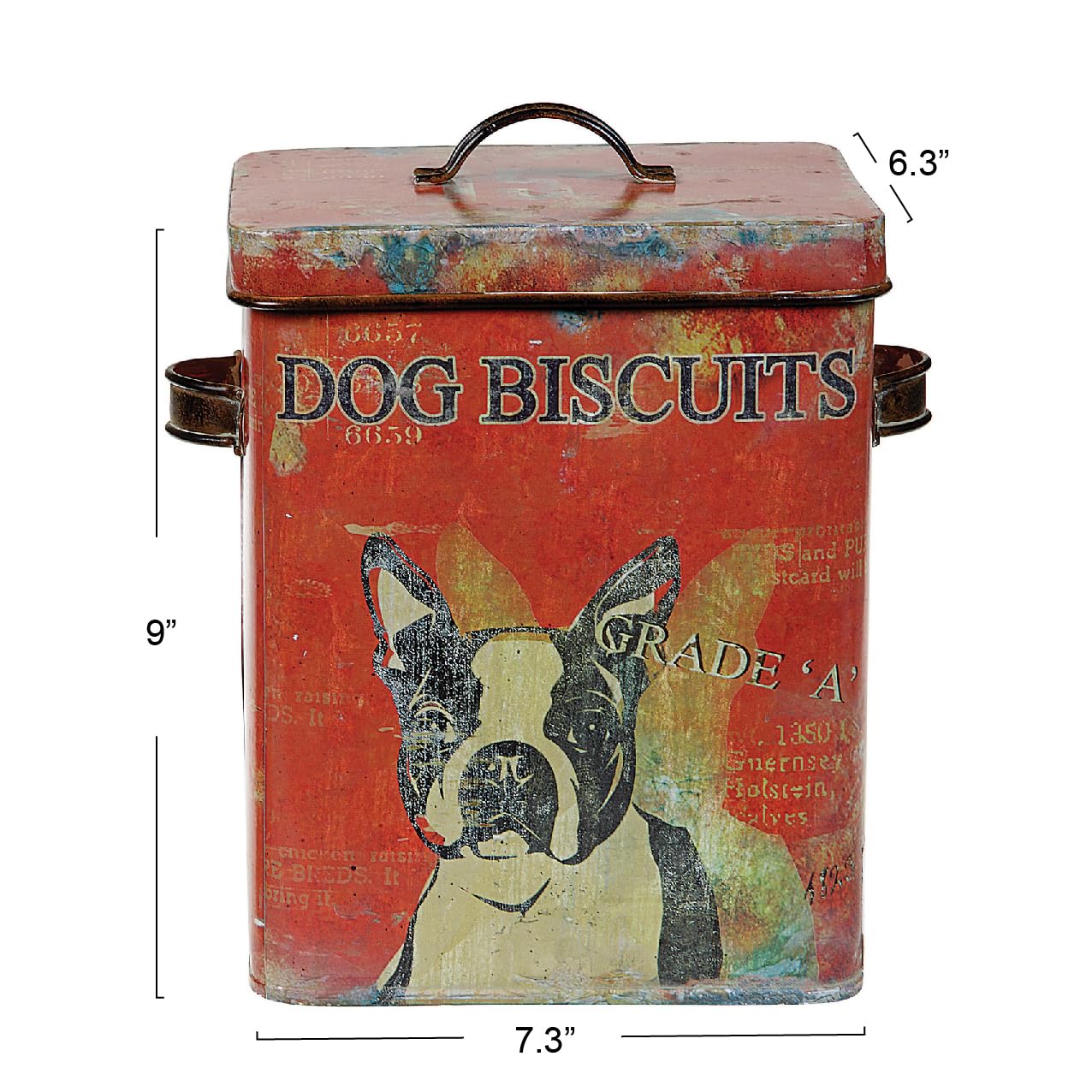 This rustic metal container showcases a printed dog illustration and accompanying "dog biscuits" message in a heavily distressed finish