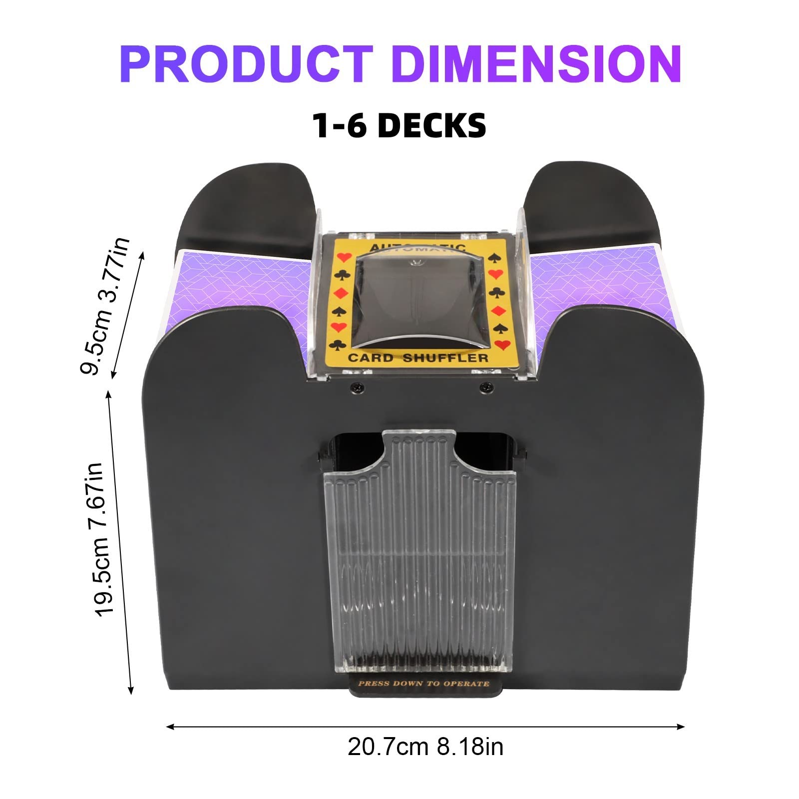 Dimensions in inches: 8.18”(L) x 3.77”(W) x 7.67”(H). Holds up to 6 standard decks of cards.Requires 4 "C" batteries (not included).Poker cards are not included
