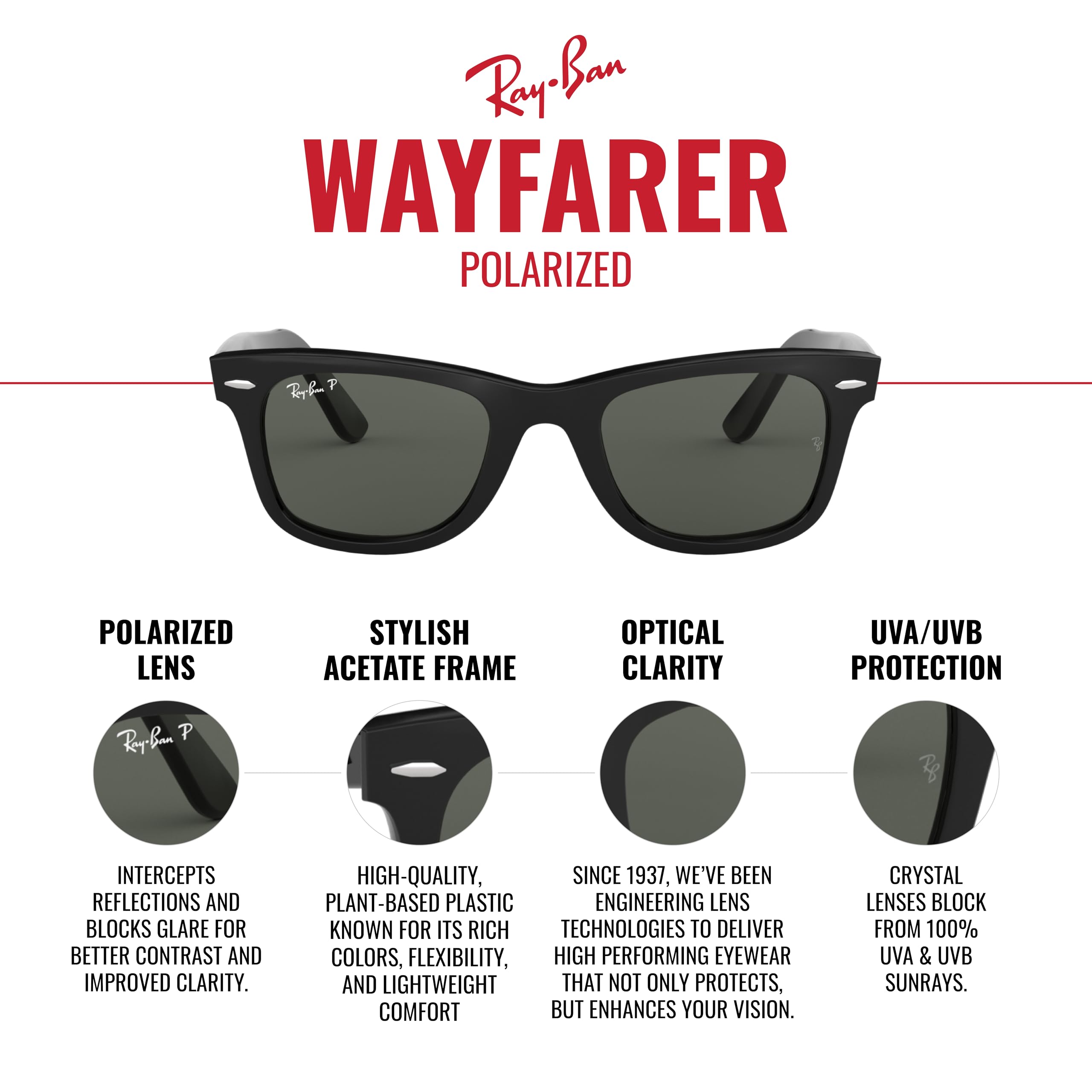 FRAME FEATURES: Original Wayfarer Classics are the most recognizable style in sunglasses history. Worn by celebrities, musicians and icons since 1952. Black frame features premium green polarized lenses for true colors, sharp vision, and reduced glare