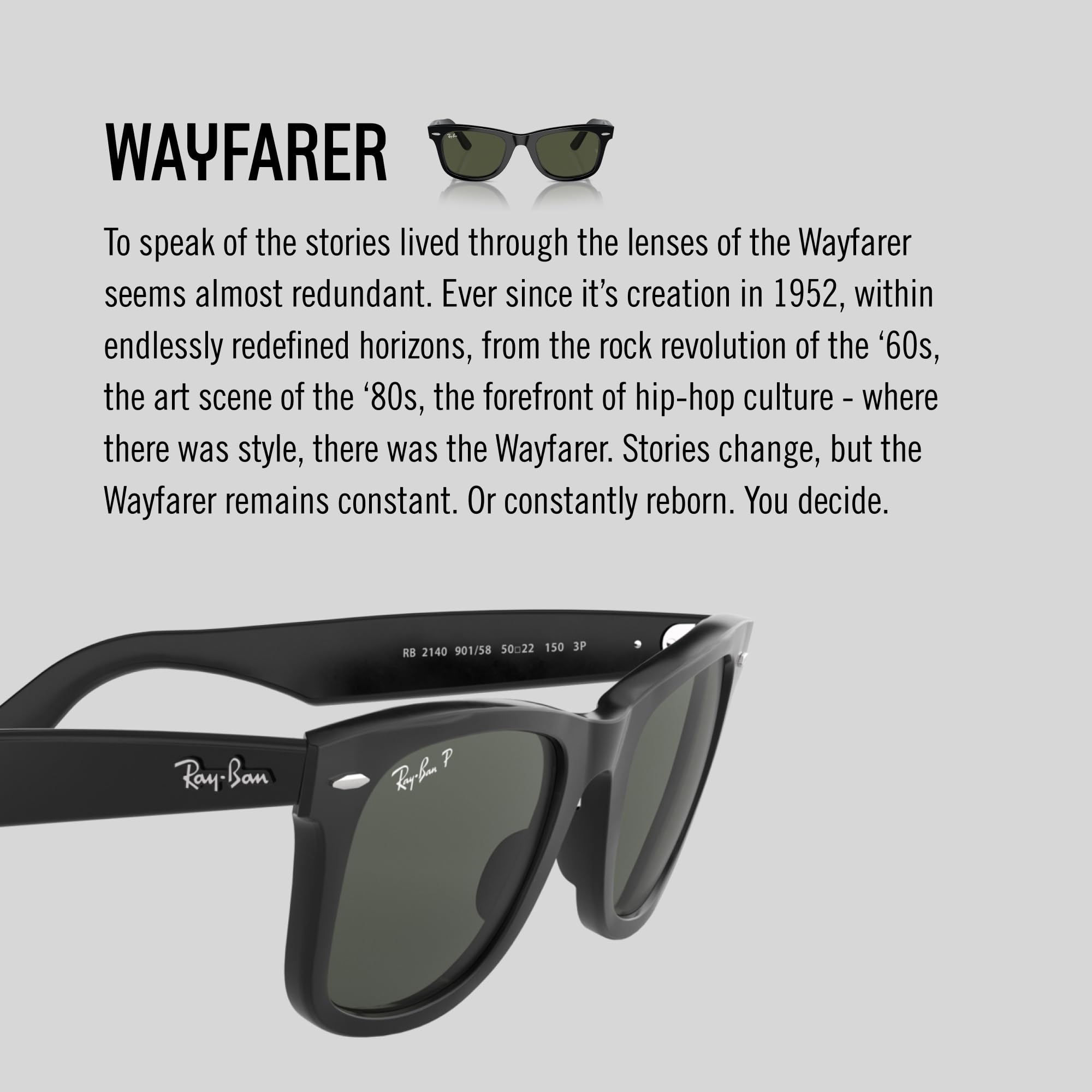 Description Born to wander, the Wayfarer has never stood still. In the early ‘50s, as moldable plastics entered the scene, the Wayfarer shifted sunglasses from function to style and the rest is history. Today, the Wayfarer continues to challenge the unexplored with timeless swagger. The RB2140 Original Wayfarer is the most recognizable style in the history of sunglasses. Since its initial design in 1952, the Wayfarer gained popularity among celebrities, musicians, artists and those with an impeccable fashion sense. As an iconic style, it always makes a statement. Available in a variety of frame and lens combinations, from black to Havana frames and gradient, solid, or polarized lenses. Ray-Ban sunglasses sold by authorized sellers, like Amazon, are eligible for all manufacturer warranties and guarantees. Click on the Ray-Ban link above the product title to shop the entire Ray-Ban sunglass and eyeglass assortment.