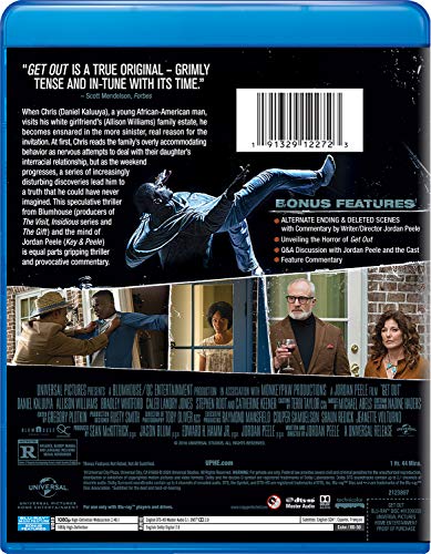 When Chris (Daniel Kaluuya), a young African-American man, visits his white girlfriend's (Allison Williams) family estate, he becomes ensnared in the more sinister, real reason for the invitation. At first, Chris reads the family's overly accommodating behavior as nervous attempts to deal with their daughter's interracial relationship, but as the weekend progresses, a series of increasingly disturbing discoveries lead him to a truth that he could have never imagined. This speculative thriller from Blumhouse (producers of The Visit, Insidious series and The Gift) and the mind of Jordan Peele (Key & Peele) is equal parts gripping thriller and provocative commentary. Bonus Content: Alternate Ending with Optional Commentary by Writer/Director Jordan Peele Deleted Scenes with Optional Commentary by Writer/Director Jordan Peele Unveiling the Horror of Get Out Q&A Discussion with Writer/Diretor Jordan Peele and the Cast Feature Commentary with Writer/Director Jordan Peele