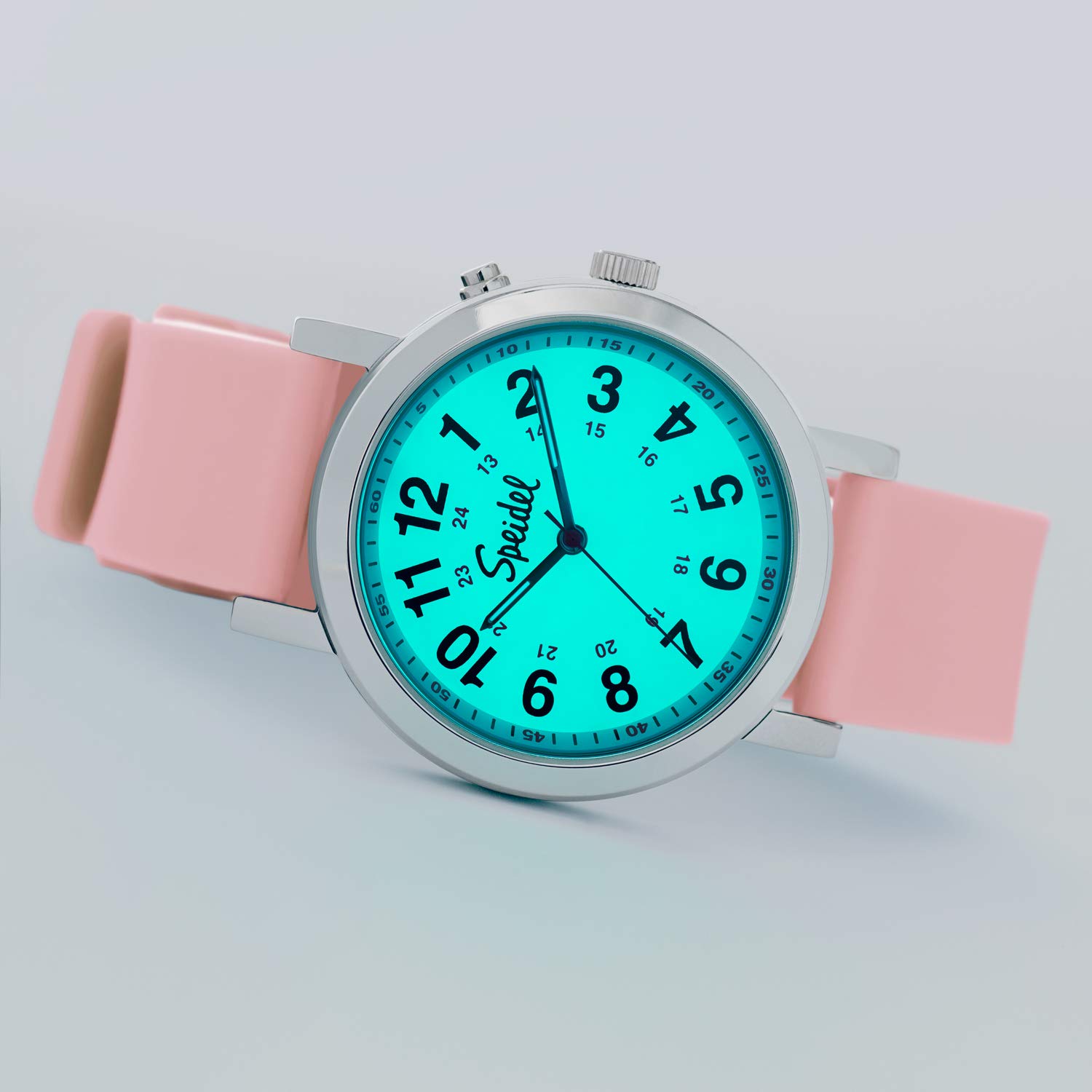 Description Taking Medical Professionals From Day To Night Well-loved by doctors, nurses, assistants, students, and beyond, the Scrub Glow Watch was crafted specifically to fit the needs of medical professionals. With a push of a button, the dial lights up on command. It is the perfect watch to take you from day to night (shift). [split] Easy-to-read:Displaying a crisp white face with 12 and 24-hour markers, the Scrub Glow Watch features a 3-hand quartz movement with a highly-visible red second hand. This allows for complete accuracy when performing pulse readings. Easy on the eyes:The electroluminescent dial lights up with the push of a button. There is no need to strain your eyes in darker settings. Easy to clean:Holds up to the unlimited number of hand washes between patients with a comfortable, water-resistant silicone band. Easy to adjust:Keep comfortable with its easy-to-adjust strap, fitting a wide range of wrist sizes, from 5” (127 mm) to 7.48” (189.9mm). Â
