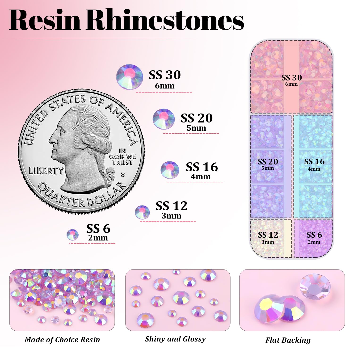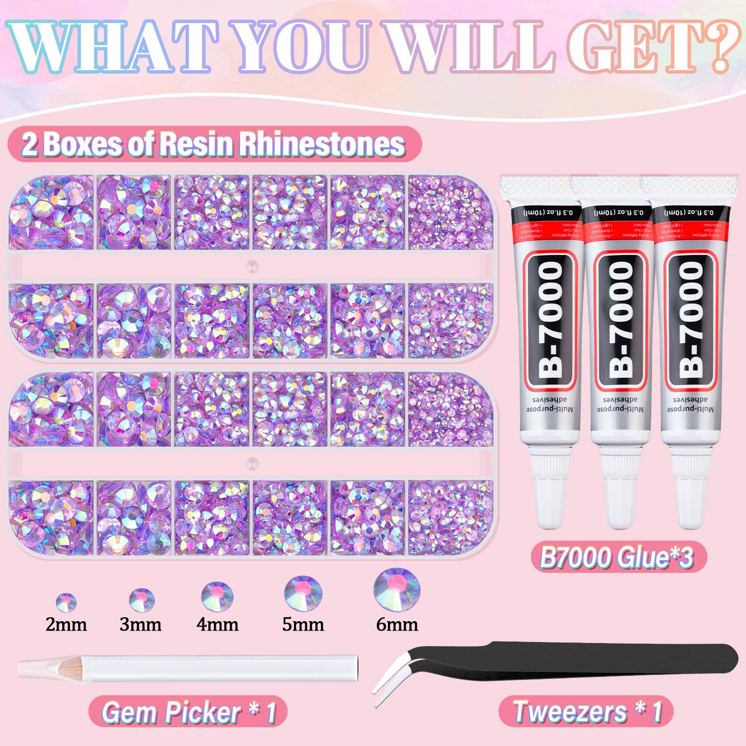 WHAT YOU WILL GET -- The package includes 2 boxes of flatback rhinestones with 12 grids in different sizes. 1 tweezers for large-size gems, 1 pickup pen for small-size gems. 3 B7000 adhesive jewels glue for jewelry making. This rhinestone kit makes it easy for you to make any craft you like, and will bedazzle your artworks! CHARMING GEMS FOR CRAFT -- These high-quality flatback bling diamonds are made of choice resin, so they are very lightweight, durable, and cost-effective. Their perfect cutting facets, delicate and exquisite shine, will make your handicrafts more dazzling and eye-catching. Our store also offers a variety of colors, which will give your crafts more possibilities. STRONG B7000 GLUE FOR GEMS -- These Non-Hotfix rhinestones are not self-adhesive and need to be used with glue. The equipped B7000 glue has strong adhesion and dries clear. It has a precision needle for easy application. For first use, you can leave the glue head up for a few minutes before opening to avoid overflow. After using, the needle needs to be cleaned with an alcohol wipe to avoid a mess. TIPS FOR USE -- Our flatback rhinestones are non-hotfix and need to be used with glue. To apply the resin rhinestones, first, clean the surface of your crafts or your nail you wish to embellish. Then, apply the rhinestones with the appropriate glue and wait for them to dry. Once the glue is completely dry, it will stick firmly to your crafts or nails, making your artwork more sparkling! WIDE APPLICATION -- These sparkling iridescent resin crystals are perfect for creating dazzling looks. Use them for bedazzling DIY crafts like shoes, tumblers, mugs, bottles, phone cases, popsockets, scrapbooks, photo frames, diamond paintings, greeting cards, bags, glasses, guitars, keychains, hats, masks, hair clips, bracelets, wristbands, clothing, wedding dresses, and more.