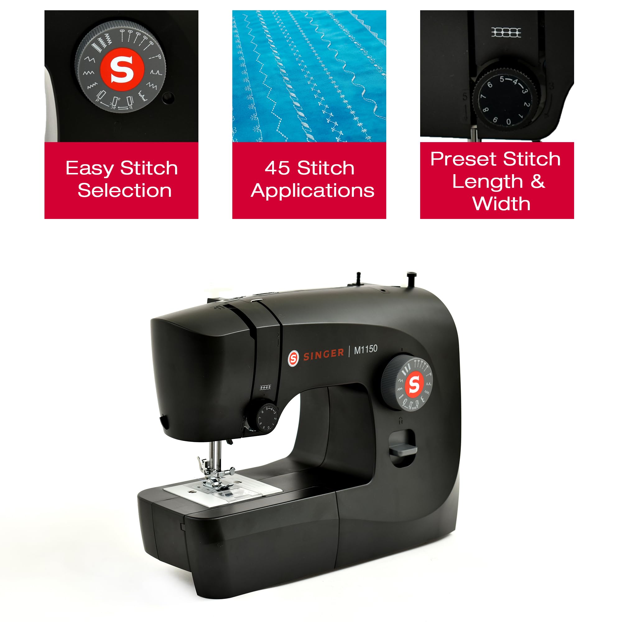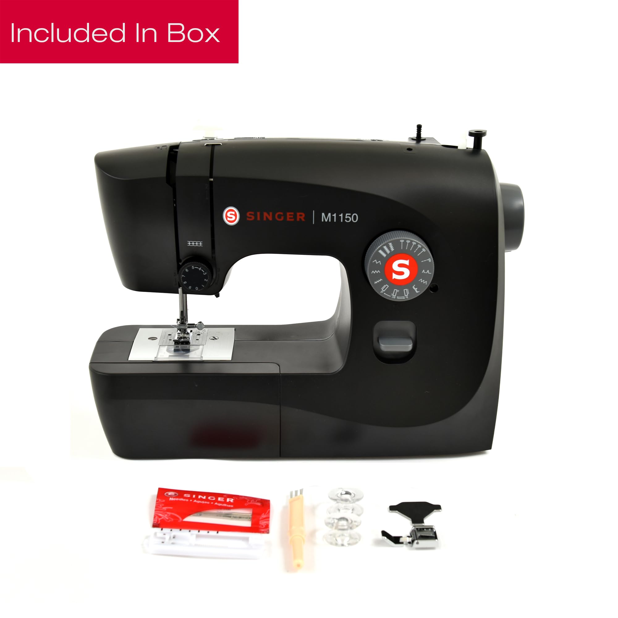 Description: The SINGER® M1150 is lightweight and portable, making it a great choice for taking to sewing class or for sewing in smaller spaces. Thanks to its ease-of-use features such as the top drop-in bobbin, 45 stitch applications, easy stitch selection and preset stitch length and width, beginners and advanced sewists will find this machine easy to use. Sew garments, piece quilts, create crafts or do simple mending – you can do it all! Included Feet and Accessories: All-Purpose Foot Buttonhole Foot Zipper Foot Seam Ripper/Brush Screwdriver Bobbins Needles Product Information: Weight: 10.41 lbs. Dimensions: 16.14” x 5.91” x 12.6”